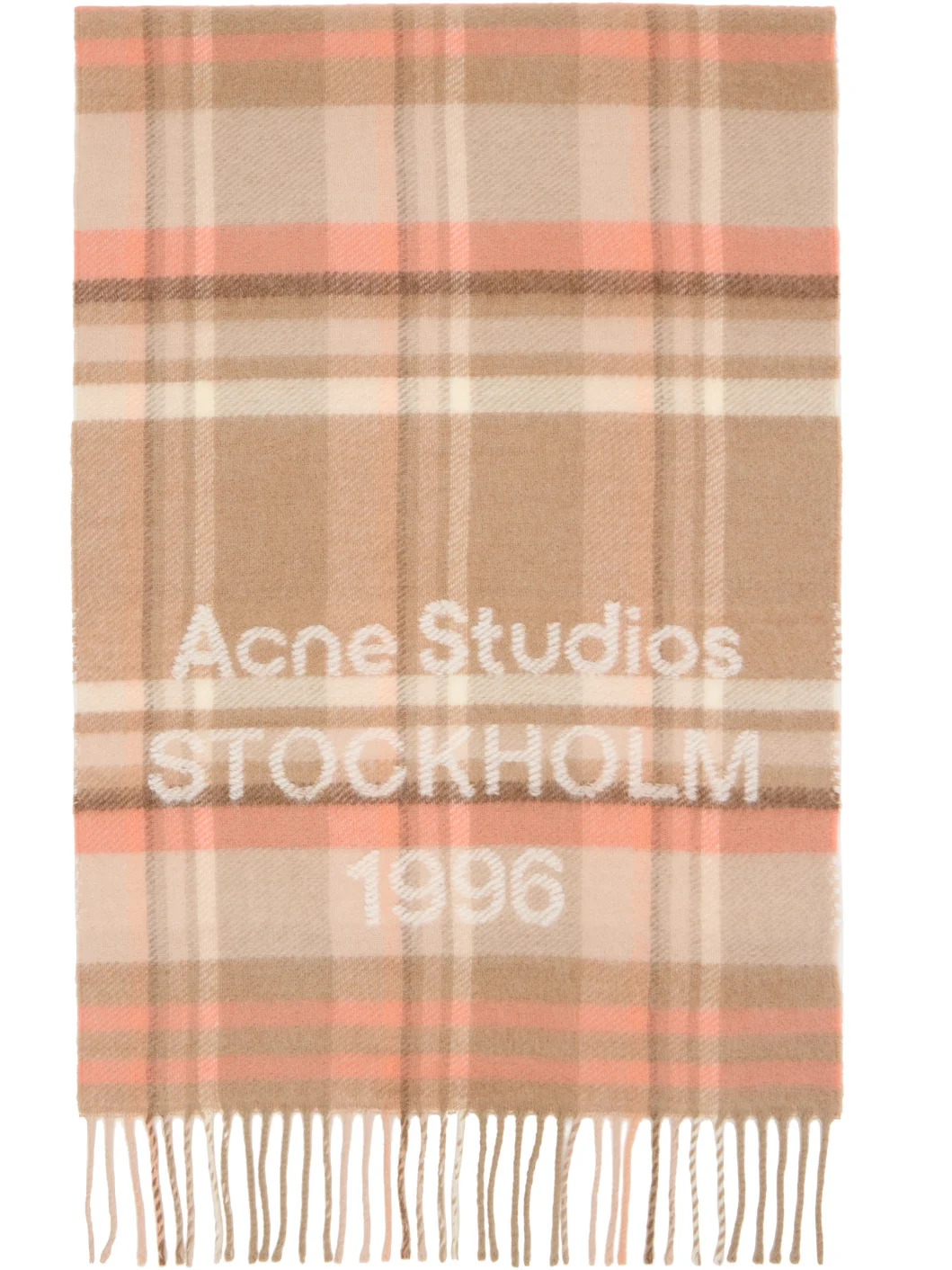 Rectangular wool-blend flannel scarf. · Check pattern throughout · Jacquard logo at face · Fringed detailing at ends · L78.75" x W15.75" Supplier color: Beige/Peach 98% wool, 2% nylon. Made in Italy 252129M150060
