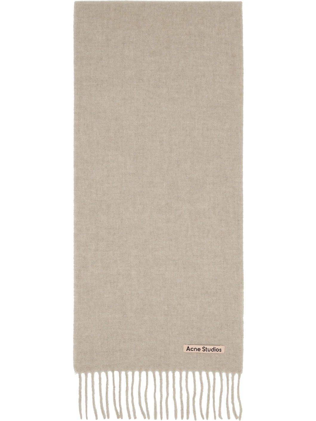 Rectangular RWS-certified wool flannel scarf. · Logo patch at face · Fringed detailing at ends · L75" x W11" Supplier color: Oatmeal melange 100% wool. Made in Italy 252129M150007