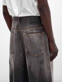 Black slubby denim shorts with high contrast fades and hand-applied dirt and paint marks. Featuring: • Loose fit and straight leg • Low waist with dropped crotch and below-knee length • 5-pocket styling • Button-up fly with leather logo patch • Shell: 100% Cotton | Patch: 100% Cow Leather • Italian sizing Model is 5'11.5" wearing size 48. Shoulders: 16" Chest: 32.5" Waist: 30"