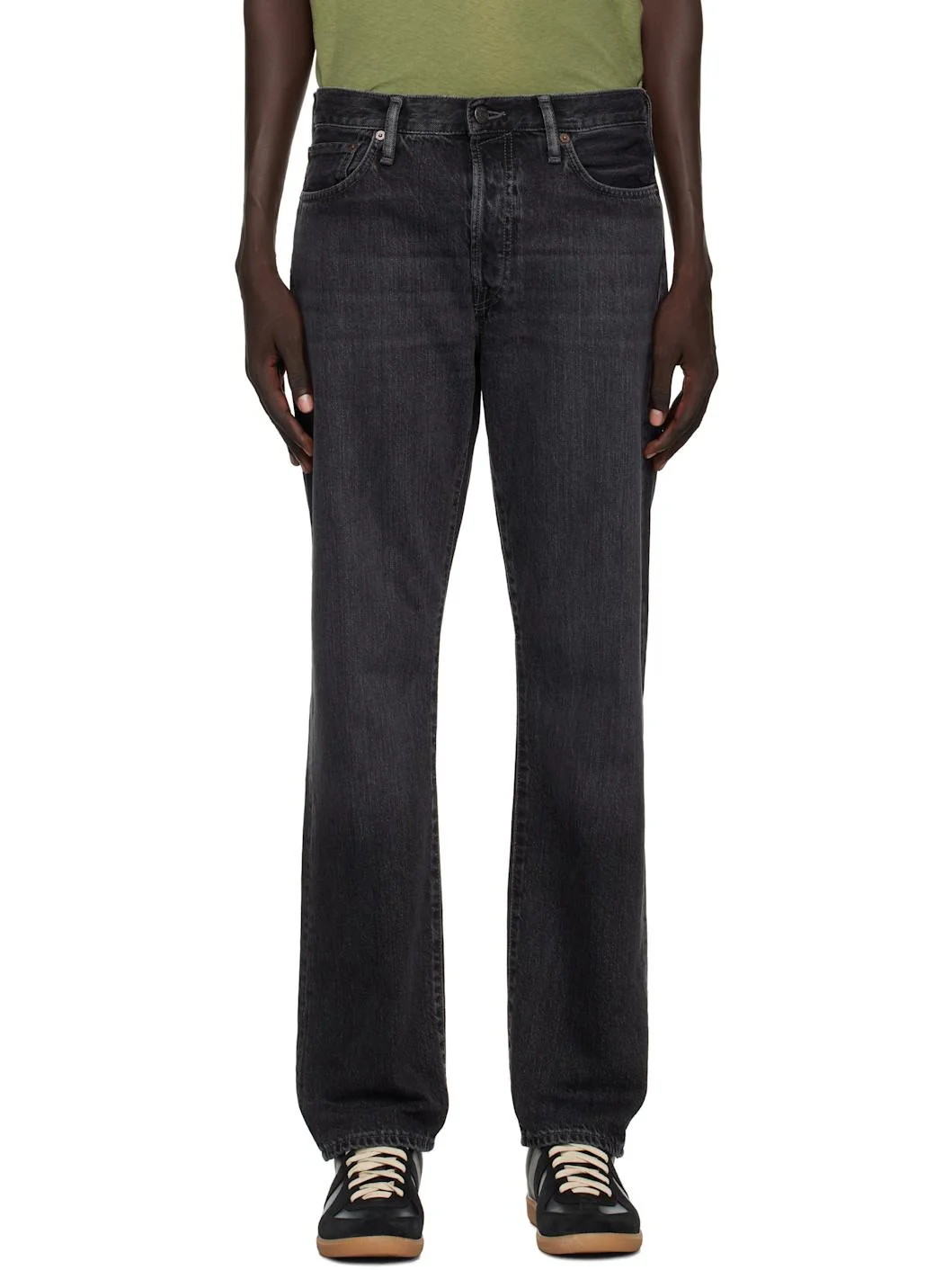 Non-stretch organic cotton denim jeans. · Fading and whiskering throughout · Belt loops · Five-pocket styling · Button fly · Leather logo patch at back waistband · Logo-engraved bronze-tone hardware Supplier color: Black Body: 100% cotton. Trim: 100% leather. Made in Italy 252129M186000