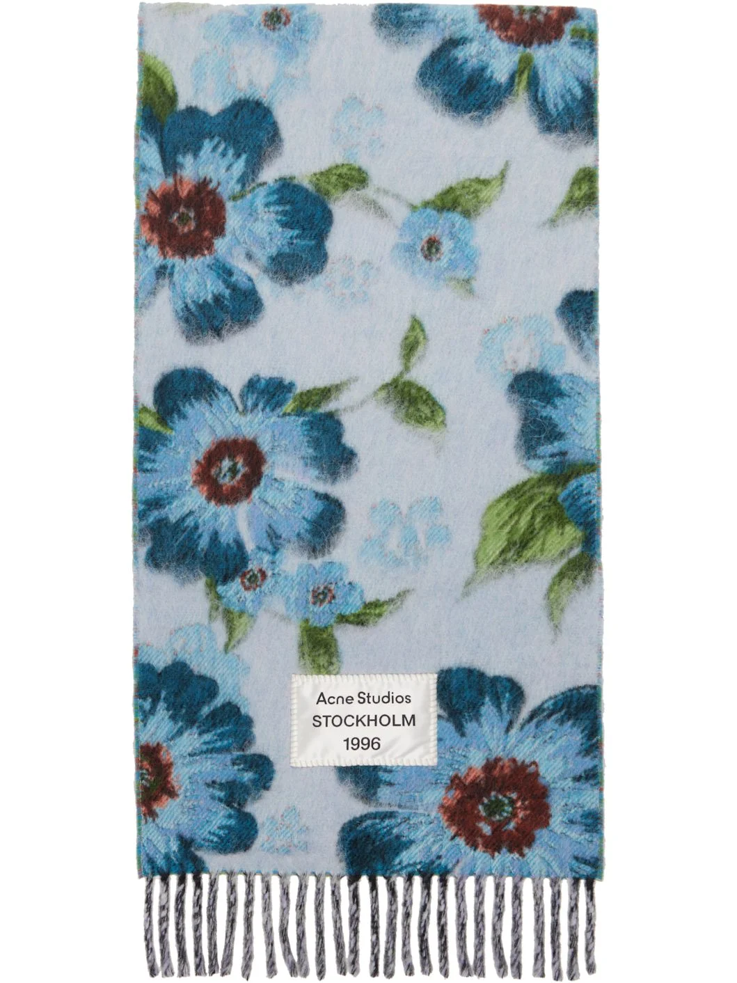 Rectangular brushed wool-blend flannel scarf. · Jacquard floral pattern throughout · Jacquard logo and logo patch at face · Fringed detailing at ends · L73" x W12.5" Supplier color: Blue 62% wool, 20% nylon, 18% alpaca. Made in Italy 261129M150025