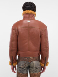 Featuring: • Slim fit • Cropped length • Shearling stand collar with straps • Waist welt pockets • Adjustable side tabs with buckles • Zipped vents and long sleeves • Front zipper closure • Metal logo plaque at back • Shell: 100% Lamb Shearling • Italian sizing Model is 6'4" wearing size 48. Shoulders: 18" Chest: 36" Waist: 28"