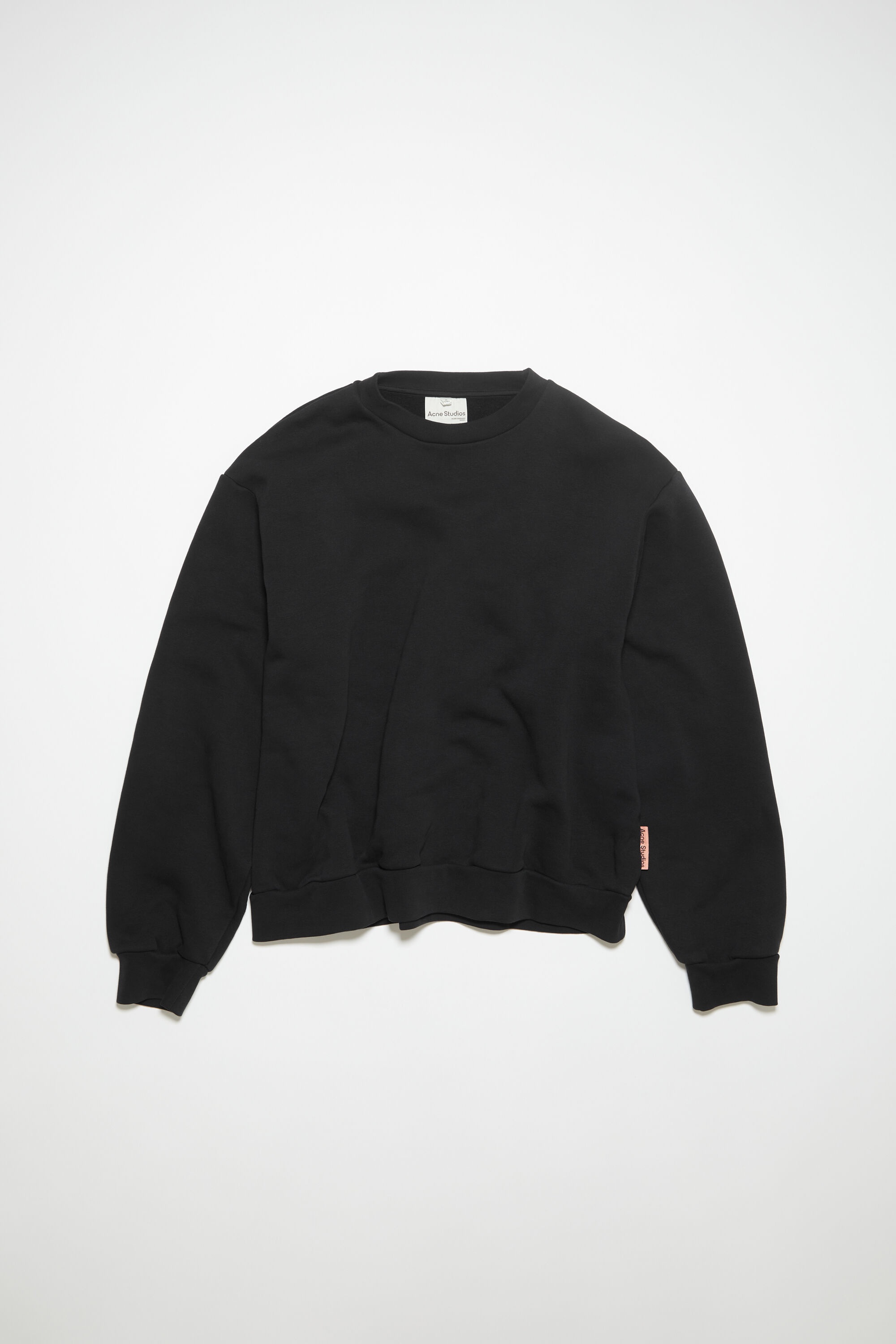 Acne Studios black crew neck sweater is crafted from a cotton blend, detailed with ribbed cuffs and hem. Cut to a relaxed unisex fit. - Relaxed unisex fit - Ribbed cuffs and hem - Acne Studios label flag on side seam - Model is 178 cm / 5′11 and wears a size XS - Model is 182.5 cm / 6′ and wears a size M - Style ID: FN-UX-SWEA000012 - Made from organically grown cotton and recycled polyester. - Shell: 66% Cotton, 34% Polyester