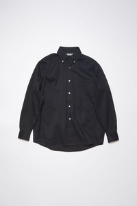Acne Studios black button-up overshirt is crafted from twill weave cotton with a crisp appearance, detailed with a chest pocket and side pockets. Complete with a visible button placket and cut to regular fit. - Regular fit - Regular length - Button-up closure - Side seam pockets - Chest pocket - Internal branding care label - Model is 188 cm / 6′2″ and wears a size 46 - Style ID: FN-MN-OUTW000932 - Main material made from organically grown cotton - Shell: 100% Cotton