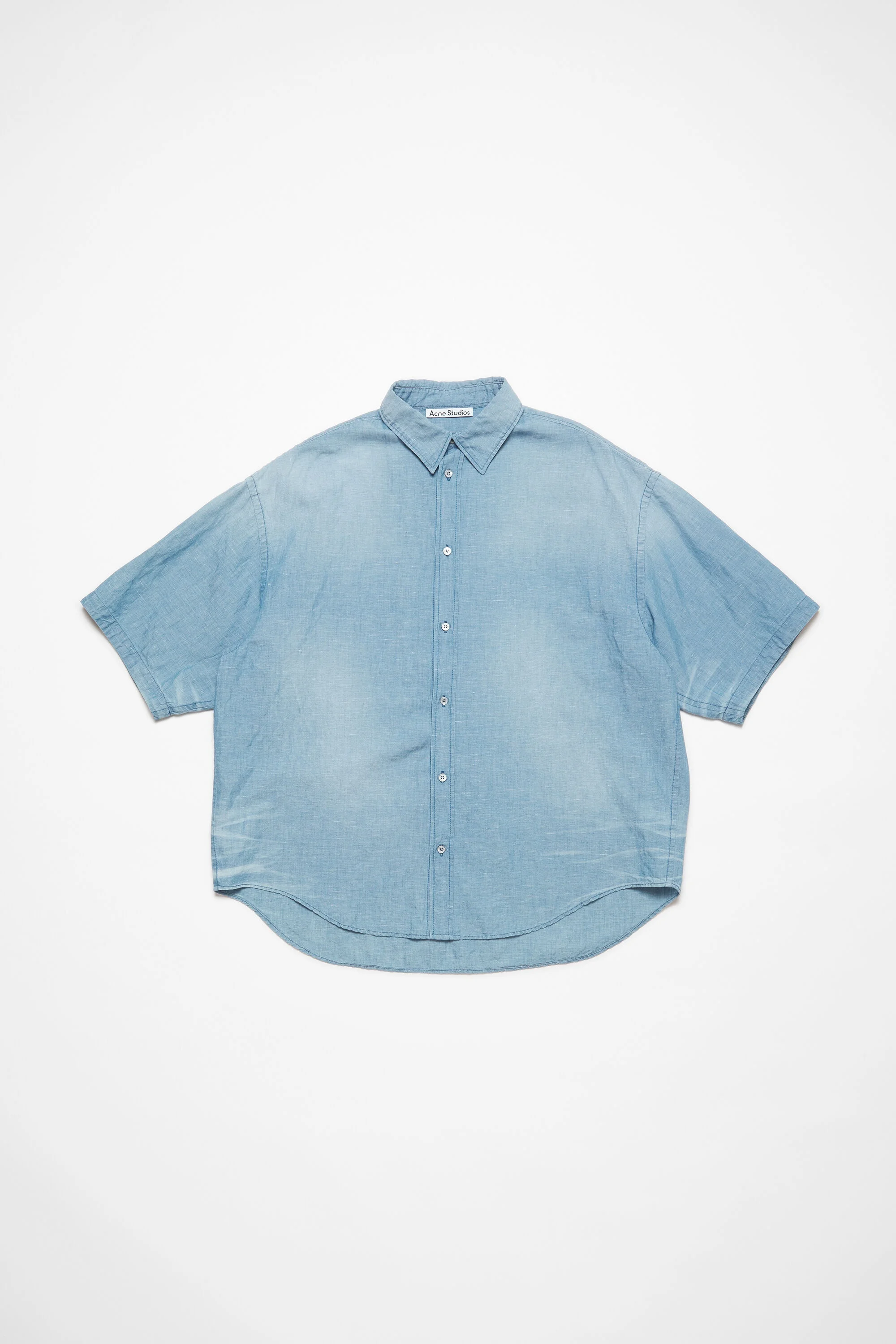 Short sleeve button-up shirt crafted in a cotton and linen blend with a garment-dyed finish, detailed with an Acne Studios 1996 logo stamp at the centre back. Cut to a relaxed fit with dropped shoulders and below-hip length. - Relaxed fit - Below hip length - Dropped shoulders - Button-up closure - Acne Studios 1996 logo stamp centre back - Model is 188.5 cm/ 6'2 and wears a size 46 - Style ID: FN-MN-SHIR000855 - Shell: 61% Cotton, 39% Linen