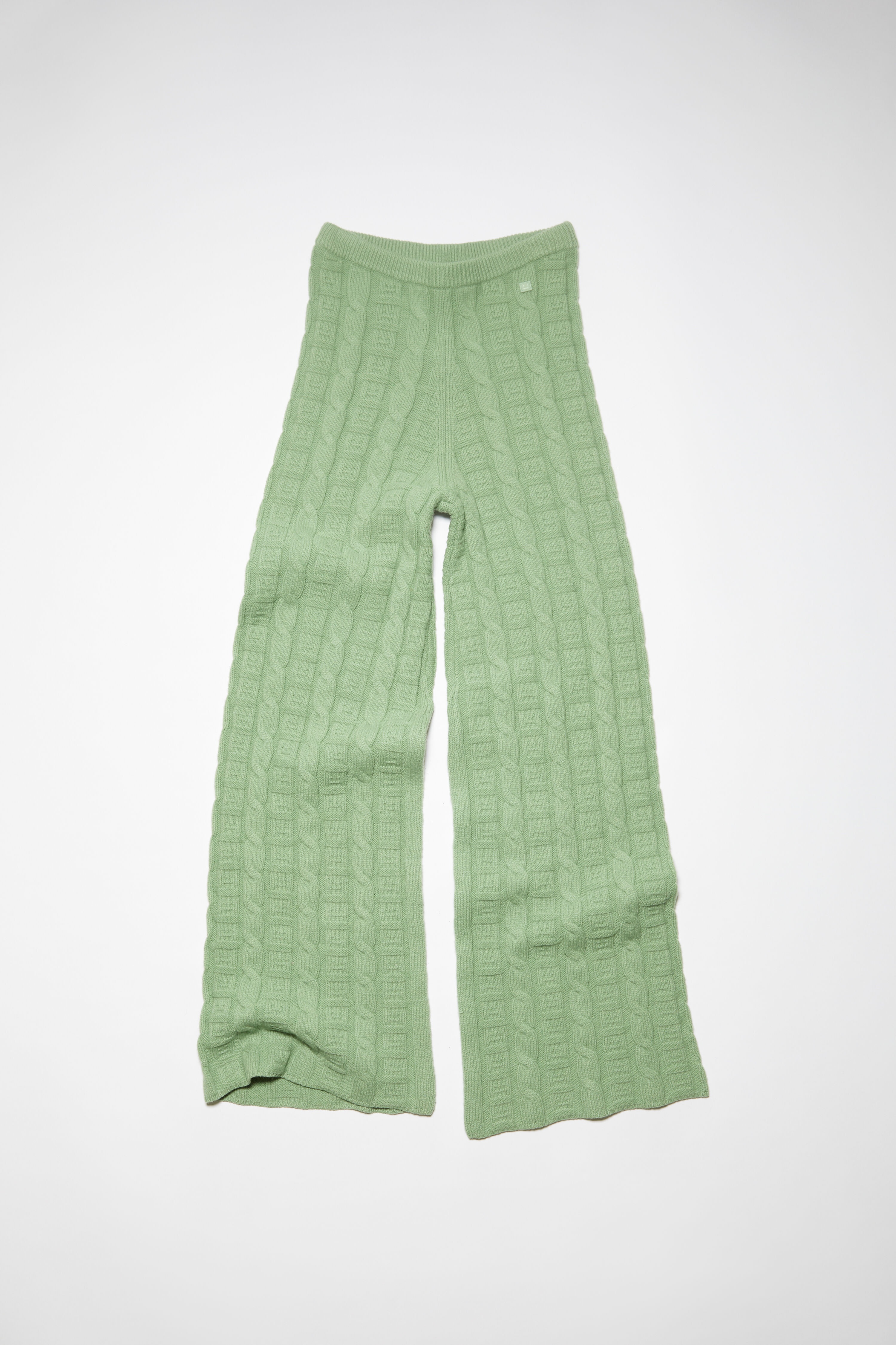Knit trousers feature a cable knit stitch with an all-over Face logo, crafted from a lambswool wool blend yarn. Cut to a fitted unisex fit, with an elasticated waist, flared leg and long length. - Fitted unisex fit - Flared leg - Long length - Elasticated waist - Cable knit with Face logo effect - Micro Face logo patch on the cuff - Female model is 178 cm / 5'11 and wears a size XS - Male model is 189 cm / 6′2 and wears a size M - Style ID: FA-UX-TROU000107 - Made with responsible wool and recycled polyester. - Shell: 87% Wool, 13% Polyester