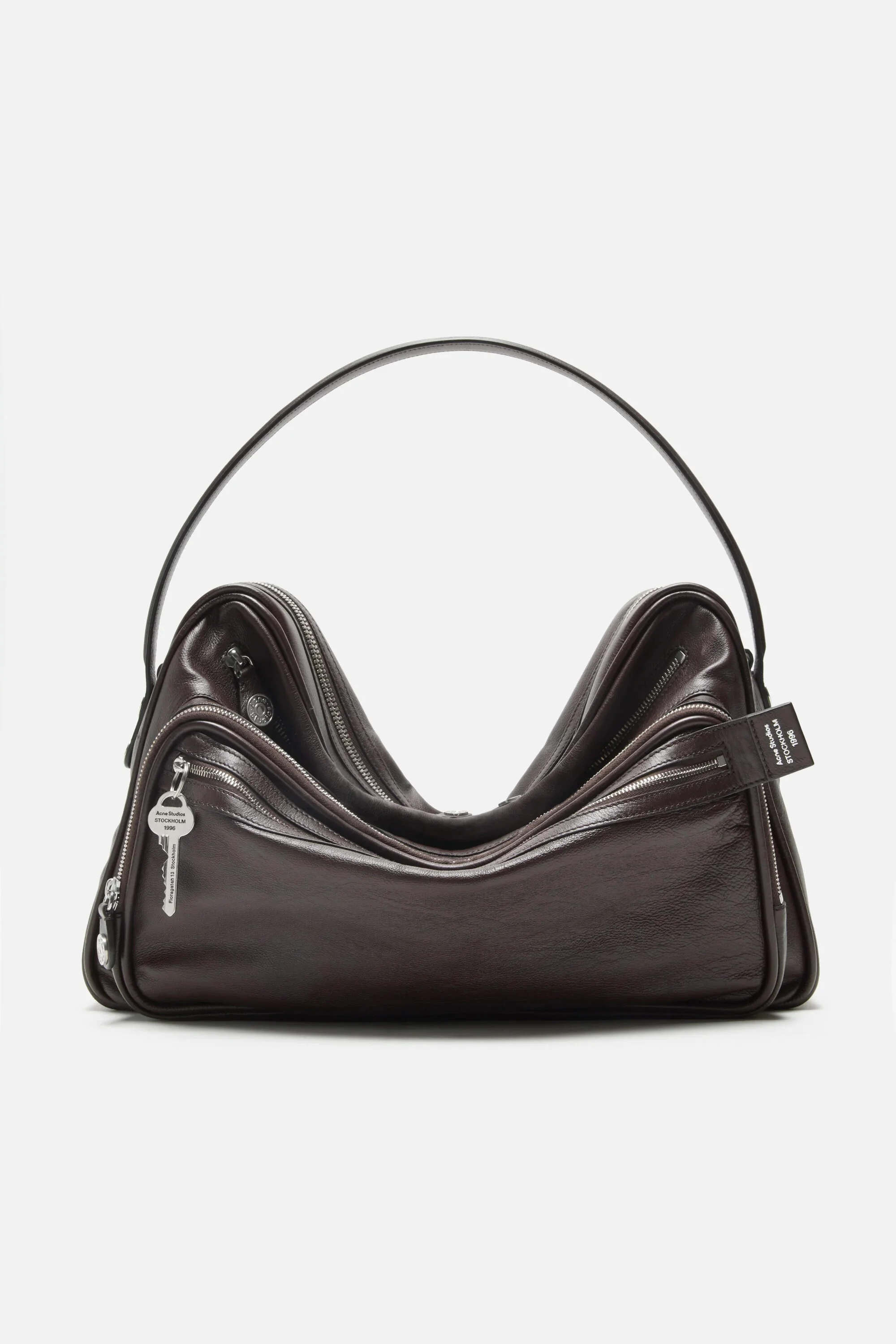 The Camero bag features a multipocket typology with a soft, rectangular design and a compact, structured silhouette. Accented with multiple zip compartments, branded key charm and signature denim-style button logo detail accents. Complete with a drop handle and adjustable crossbody strap for seamless wear. Bag is styled with accentuated shape to give it a modern, relaxed attitude through its distinctive collapsed silhouette. - Shoulder bag - Drop handle and adjustable crossbody strap - Silver-toned zip compartments and denim-style button - Branded key charm - Acne Studios logo embossed - Measurements: 28 cm; 42 cm; 11 cm - Drop handle measurements: 8 cm, max - Crossbody strap measurements: Adjustable 42 cm to 65 cm - Style ID: Camero Camera - Shell made from leather from a Leather Working Group (LWG) certified tannery with Gold rating - Shell: 100% Calf leather, Lining: 50% Polyester, 50% Polyurethane
