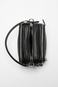 The Camero bag features a multipocket typology with a soft, rectangular design and a compact, structured silhouette. Crafted from small-grain shiny leather, it is accented with multiple zip compartments, a branded key charm, and signature denim-style button logo details. Complete with a drop handle and adjustable crossbody strap for versatile wear, the bag is styled with an accentuated shape that gives it a modern, relaxed attitude through its distinctive collapsed silhouette. - Multipocket bag - Small grained shiny leather - Drop handle and adjustable crossbody strap - Acne Studios logo embossed with silver film - Silver metal finishing - Branded key charm - Measurements: Height: 120mm, Width: 200mm, Depth: 110mm - Crossbody strap measurements: Adjustable 46 cm to 65 cm - Style ID: CAMERO KIT - Shell made from leather from a Leather Working Group (LWG) certified tannery with Silver rating. Lining made from ECONYL® recycled Nylon - Shell: 100% Calf leather, Lining: 50% Polyester, 50% Polyurethane