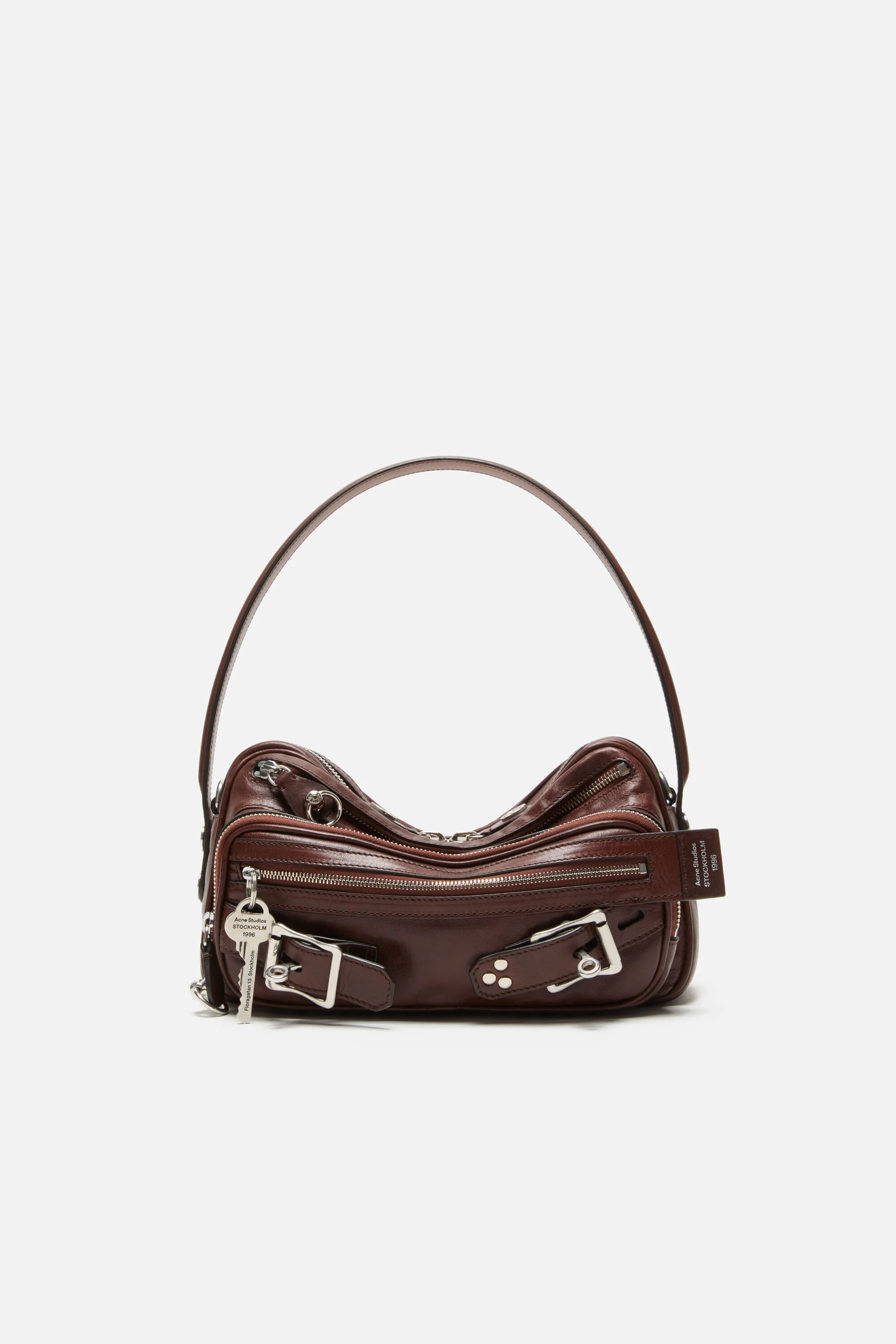 Camero Party bag crafted from soft oiled leather with buckle details and a multi-pocket design. Features zip compartments, a branded key charm, a signature denim-style button logo, and the Acne Studios 1996 logo embossed in silver. Completed with silver metal hardware, a drop handle, and an adjustable crossbody strap. - Shoulder bag - Buckle details - Drop handle and adjustable crossbody strap - Silver-toned zip compartments and denim-style button details - Branded key charm - Acne Studios logo embossed with silver film - Measurements: 16 cm; 26 cm; 7 cm - Drop handle measurements: 15 cm, max - Crossbody strap measurements: Adjustable 46 cm to 65 cm - Shell: 100% Calf leather, Lining: 100% Nylon