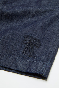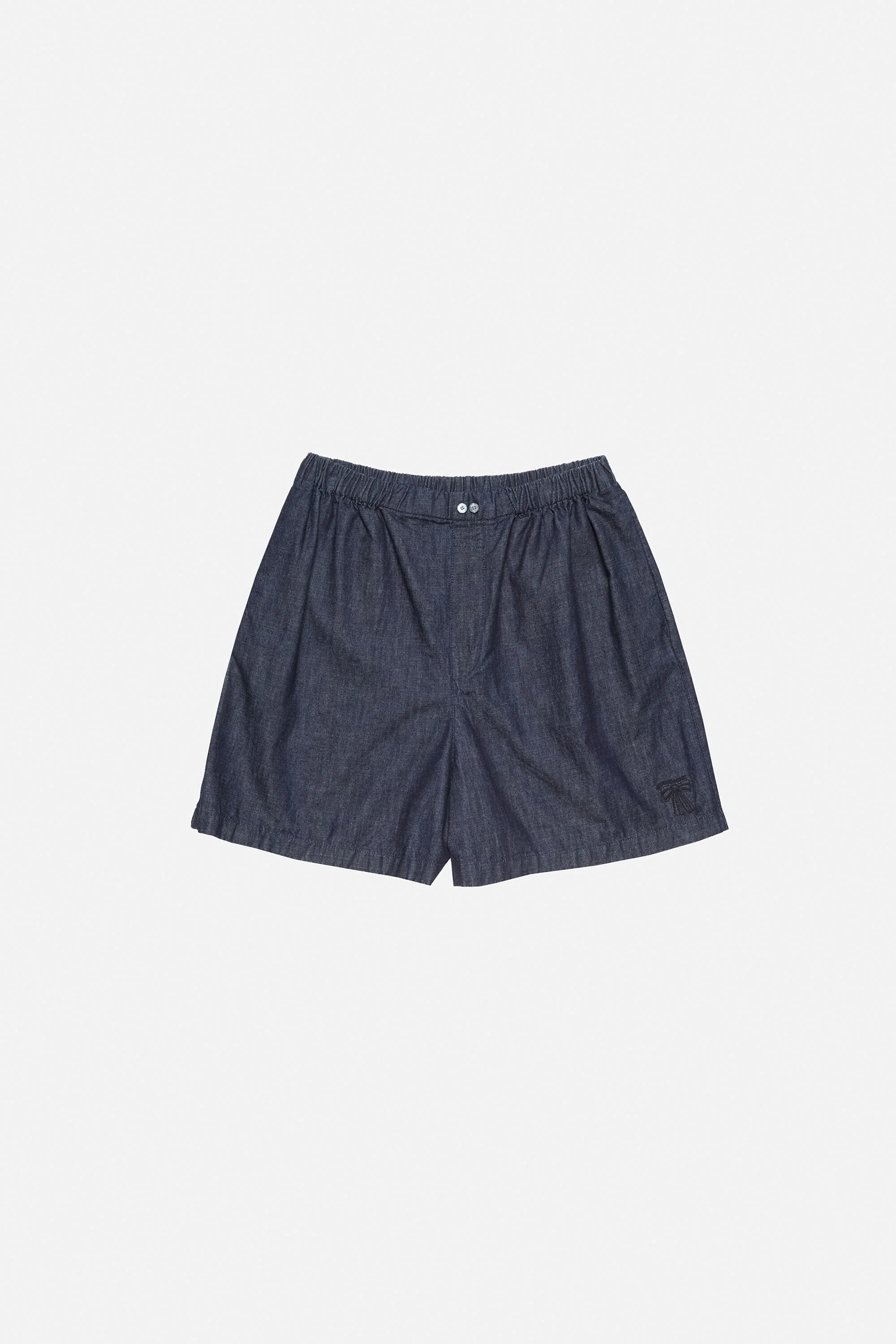 Casual shorts crafted from washed organic cotton denim, featuring an elasticated waist with branded button details and a faux fly. Completed with side pockets and an embroidered seasonal bow logo on the hem. Cut to a regular fit with a mid waist and above-knee length. - Regular fit - Mid waist - Above-knee length - Elasticated waistband with branded button - Faux fly - Side pockets - Back welt pocket - Embroidered seasonal bow logo on hem - Model is 188 cm / 6'2 and wears a 46 - Style ID: FN-MN-SHOR000330 - Made from organically grown cotton - Shell: 100% Cotton