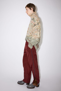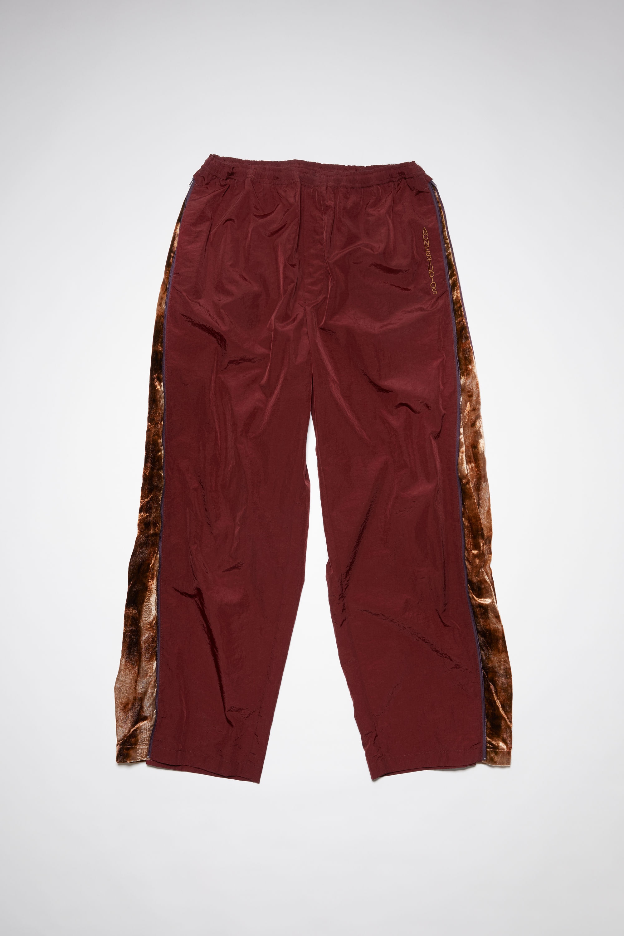 Acne Studios burgundy casual trousers are crafted from crinkled nylon and feature a zippered crushed printed velvet contrast. Completed with an elasticated waistband, discrete side pockets, and embroidered 'Acne Studios' logo. - Crinkled nylon with zippered crushed printed velvet contrast - Elasticated waistband with drawstring closure - Hidden pockets - Embroidered 'Acne Studios' logo - Style ID: FN-MN-TROU000649 - Relaxed fit - Regular rise - Model is 187 cm / 6′2″ and wears a size 48 - Shell: 100% Nylon, Contrast: 75% Viscose, 25% Nylon