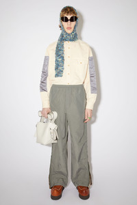 Acne Studios fox grey casual trousers are crafted from crinkled nylon and feature a zippered crushed printed velvet contrast. Completed with an elasticated waistband, discrete side pockets, and embroidered 'Acne Studios' logo. - Crinkled nylon with zippered crushed printed velvet contrast - Elasticated waistband with drawstring closure - Hidden pockets - Embroidered 'Acne Studios' logo - Style ID: FN-MN-TROU000649 - Relaxed fit - Regular rise - Model is 183 cm / 6′0″ and wears a size 48 - Shell: 100% Nylon, Contrast: 75% Viscose, 25% Nylon