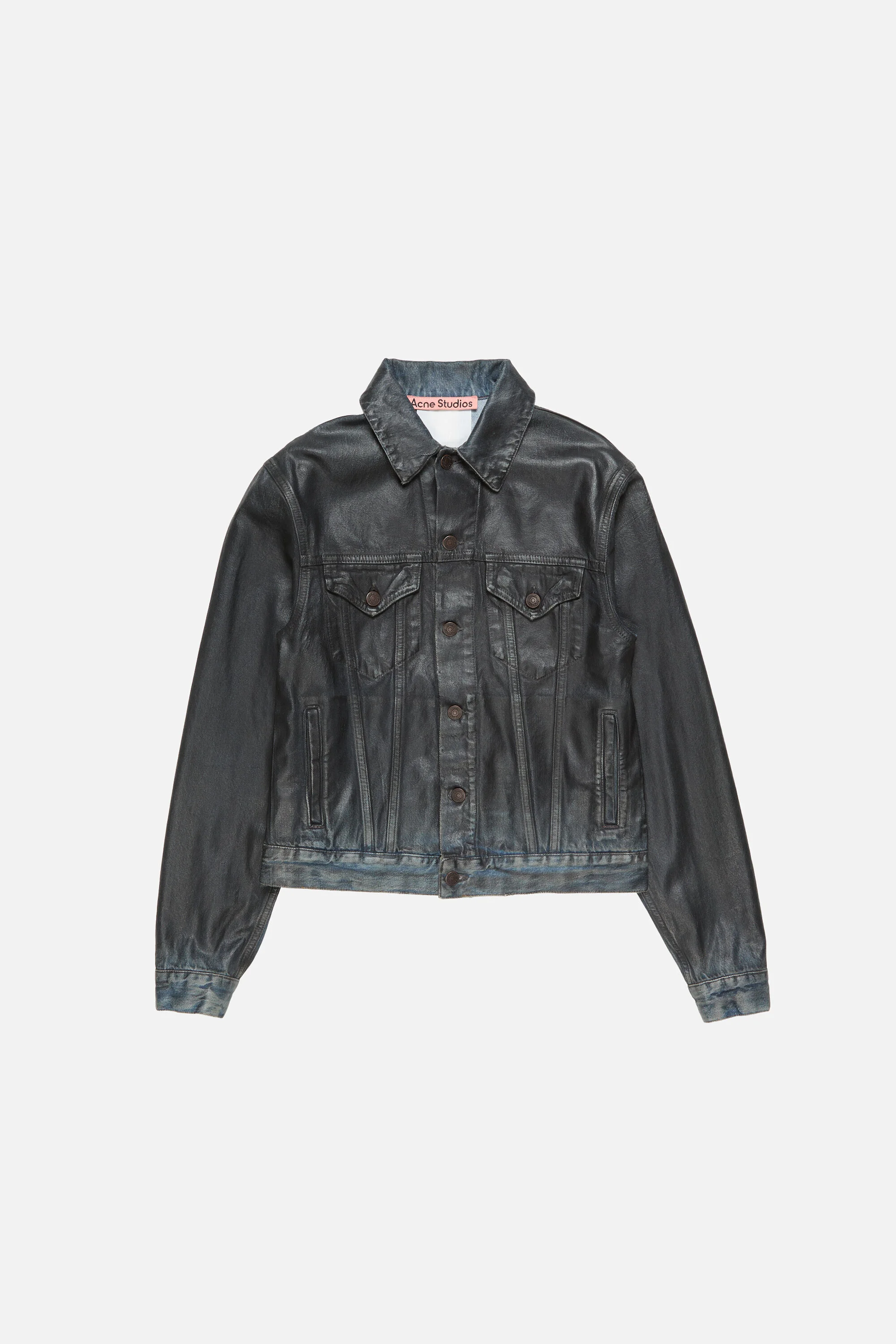 Denim jacket features a pressed black leather finish on washed indigo Tencel denim. Unlined, it is designed with a center-front branded button closure, chest pockets, and welt pockets. Cut to a regular fit with waist length. - Denim jacket - Regular fit - Waist length - Pressed black leather finish - Branded button closure - Chest pockets - Welt pockets - Model is 186 cm / 6'1 and wears a size Small - Style ID: FN-UX-OUTW000104 - Shell made with organic cotton - Shell: 40% Lyocell, 60% Cotton