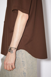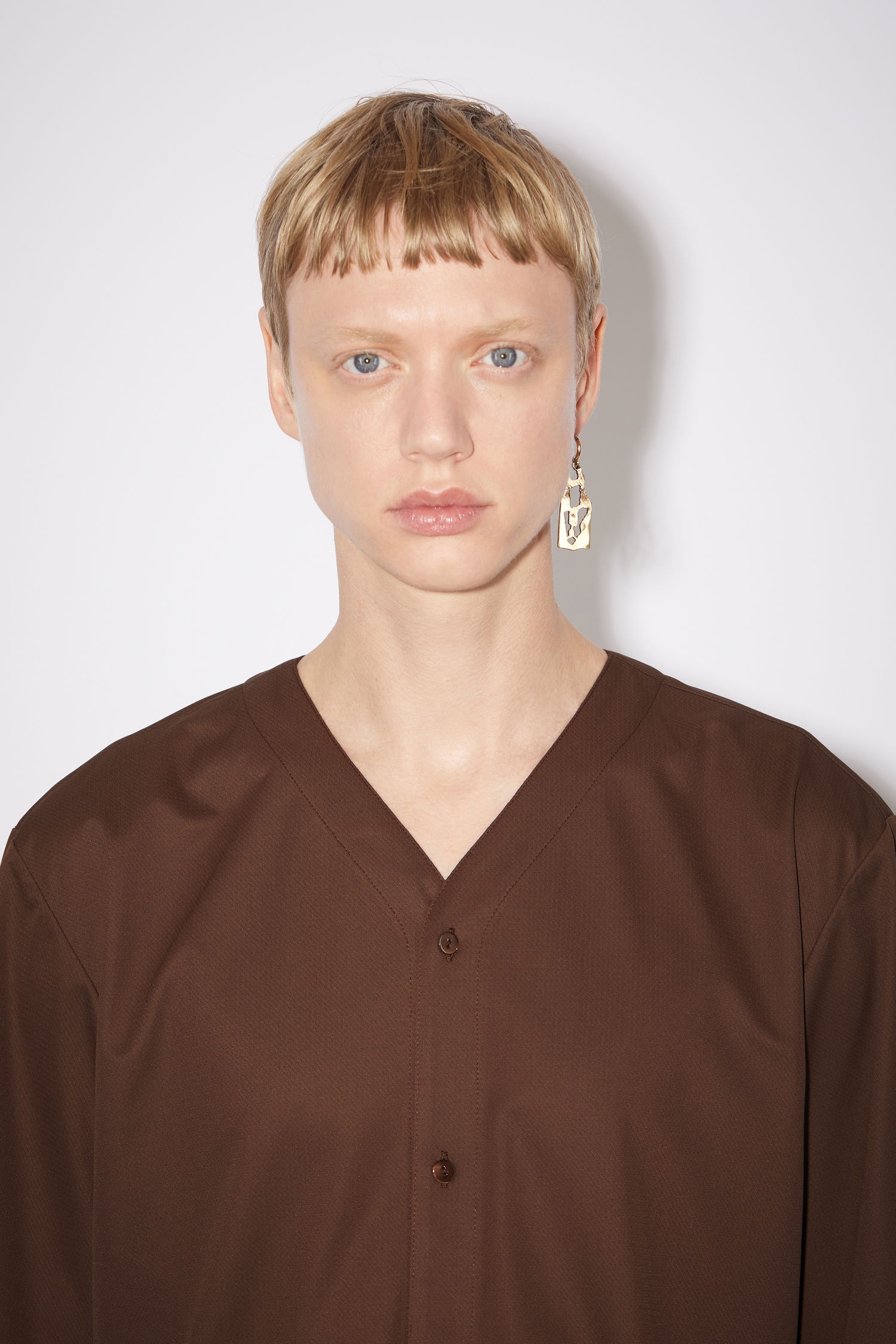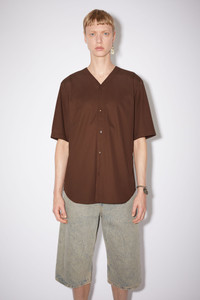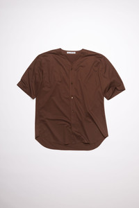 Acne Studios dark brown collarless casual shirt has short sleeves and a regular fit.
