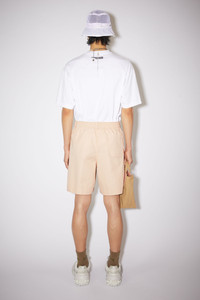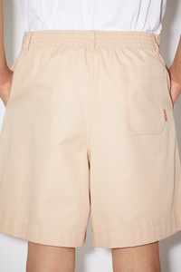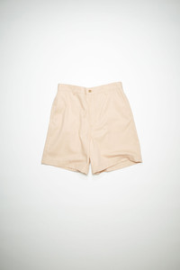 Acne Studios wheat beige regular fit casual shorts are made of a cotton blend with an elasticated waistband at the back and a crisp, workwear-inspired silhouette. Accented with a pink Acne Studios logo on the back pocket. - Waistband with belt loops - Elastic waist at back - Zipper fly closure - Pockets - Pink label - Workwear twill - Style ID: FN-MN-SHOR000091 - Regular fit - Knee length - European sizing - Model is 185cm/ 6'0" and wears a size 46 - Main material: 65% cotton, 35% polyester