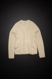 Acne Studios ecru beige crew neck jumper is crafted from wool with a brushed appearance, detailed with an Acne Studios initials embroidery on the chest. Cut to a regular fit. - Regular fit - Hip length - Crew neck - Acne Studios initials embroidery - Model is 188 cm / 6′2″ and wears a size M - Style ID: FN-MN-KNIT000401 - Made with certified wool according to the Responsible Wool Standard - Shell: 100% Wool, Embroidery: 100% Polyester