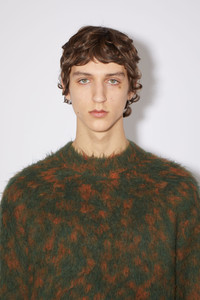 Acne Studios forest green/orange crew neck jumper features an irregular spotty pattern and is crafted from a brush hairy woolly fabric. Cut to a regular fit and detailed with a ribbed collar, hem and cuffs. Details: - Brushed hairy woolly fabric - Irregular spotty pattern - Crew neck - Ribbed collar, hem and cuffs - Style ID: FN-MN-KNIT000340 - Shell: 49% Acrylic, 17% Nylon, 16% Mohair, 16% Wool, 2% Elastane Sizing: - Regular fit - Hip length - Model is 183cm/ 6'0" and wears a size M