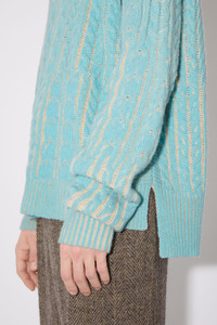 Acne Studios turquoise blue jumper is crafted from certified wool-blend according to the Responsible Wool Standard and features a contrasting pigment ink print on the cable knit. Complete with ribbed detailing on the neckline, cuffs and hem. Cut to a regular silhouette with elongated sleeves and a regular length. - Crew neck - Cable knit with contrast pigment ink print - Ribbed neckline, cuffs and hem - Style ID: FN-MN-KNIT000358 - Regular fit - Elongated sleeves - Hip length - Model is 187 cm / 6'1" and wears a size M - Shell: 80% Wool, 20% Nylon