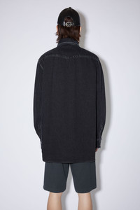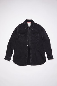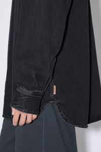 Acne Studios vintage black denim shirt is cut to an oversized fit with a curved hemline, crafted from cotton. Detailed with a front snap button-up closure, and chest pockets. - Oversized fit - Regular length - Curved hemline - Snap button-up front closure - Snap button chest pockets - Model is 189 cm/ 6'1 and wears a size 46 - Style ID: FN-MN-SHIR000625 - Main material made from organically grown cotton - Shell: 100% Cotton