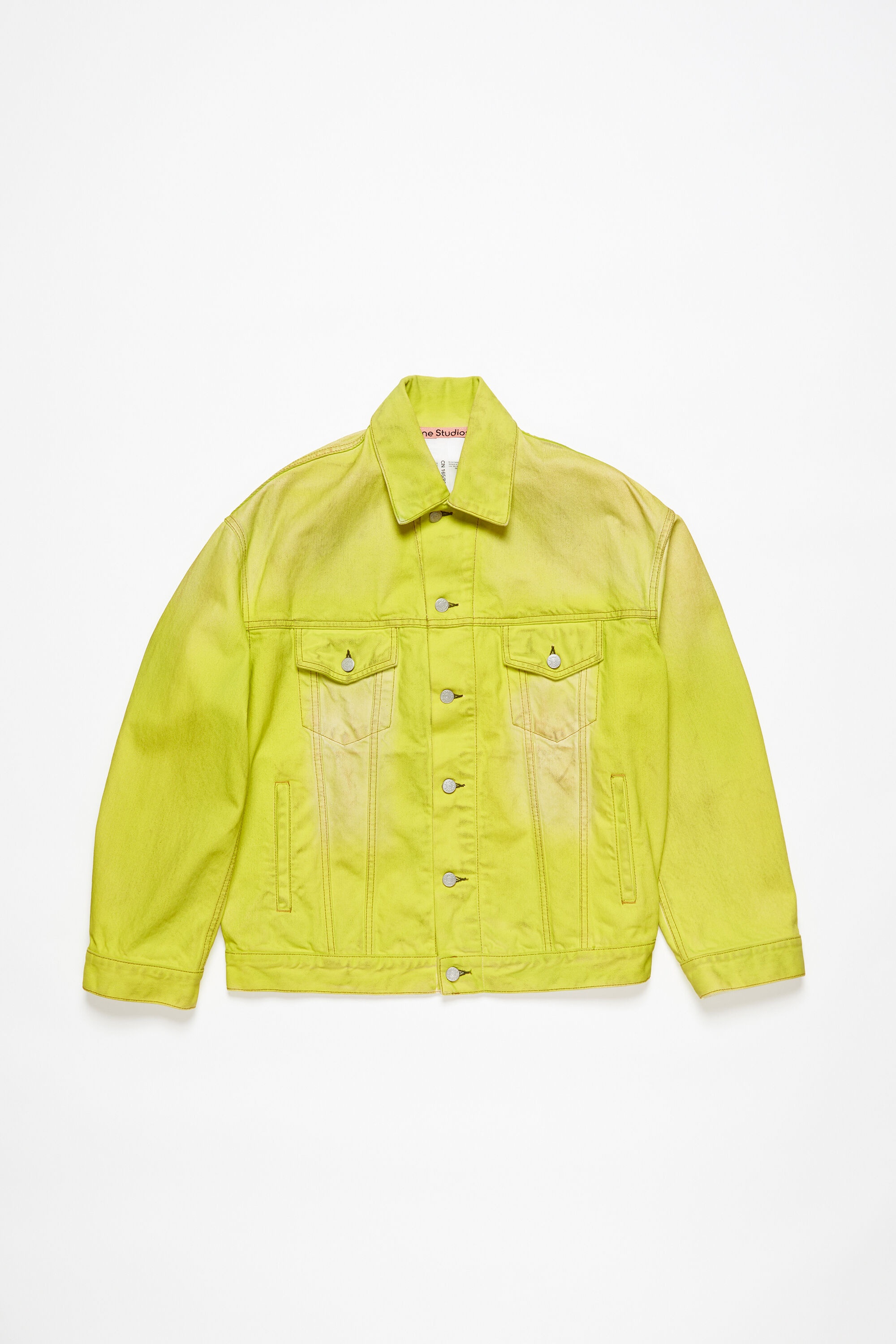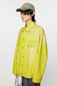 Denim jacket is cut to an oversized unisex fit with dropped shoulders, extra long sleeves and a hip length. Crafted from non-stretch denim in a neon yellow wash with a shiny coated finish and all–over smudge detail. - Oversized unisex fit - Hip length - Dropped shoulders - Extra long sleeves - Button-up closure - Female model is 176 cm / 5′10 and wears a size S/M - Male model is 186 cm / 6′2 and wears a size S/M - Style ID: FN-UX-OUTW000043 - Made from organically grown cotton. - Shell: 100% Cotton