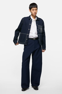 Jacket crafted from indigo denim with a workwear-inspired look. Features a button closure and front patch pockets, finished with embroidered seasonal bow artwork on the chest pocket. Cut to a regular fit and hip length. - Regular fit - Hip length - Button-up closure - Patch pockets - Embroidered seasonal bow artwork - Female model is 178 cm / 5'8 and wears a size 36 - Male model is 189 cm / 6′2 and wears a size 46 - Style ID: FN-UX-OUTW000087 - Made from organically grown cotton - Shell: 100% Cotton