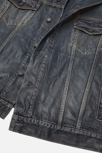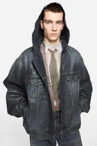 Hooded denim jacket with a glossy coated finish and subtle fade effects that reveal the base fabric. Designed with a worn-in texture, front flap and side pockets, and adjustable waist tabs. Cut to a relaxed unisex fit and hip length. - Relaxed fit - Hip length - Hooded - Front flap and side pockets - Female model is 178 cm / 5'8 and wears a size XS - Male model is 186 cm / 6'2 and wears a size M - Style ID: FN-UX-OUTW000084 - Made with organically grown cotton - Shell: 100% Cotton