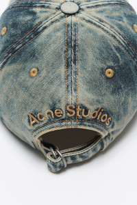 Six-panel baseball cap crafted from organic denim with a mineral dye, featuring irregular bleach and dirt marks for an authentic worn-in look. Detailed with a seasonal Acne Studios logo embroidery at the back and finished with an adjustable D-ring closure. - Six panel design - Acne Studios logo embroidery - Adjustable d-ring closure - Measurement: 59 cm - Style ID: FN-UX-HATS000328 - Made with organically grown cotton - Shell: 100% Cotton, Lining: 65% Polyester, 35% Cotton