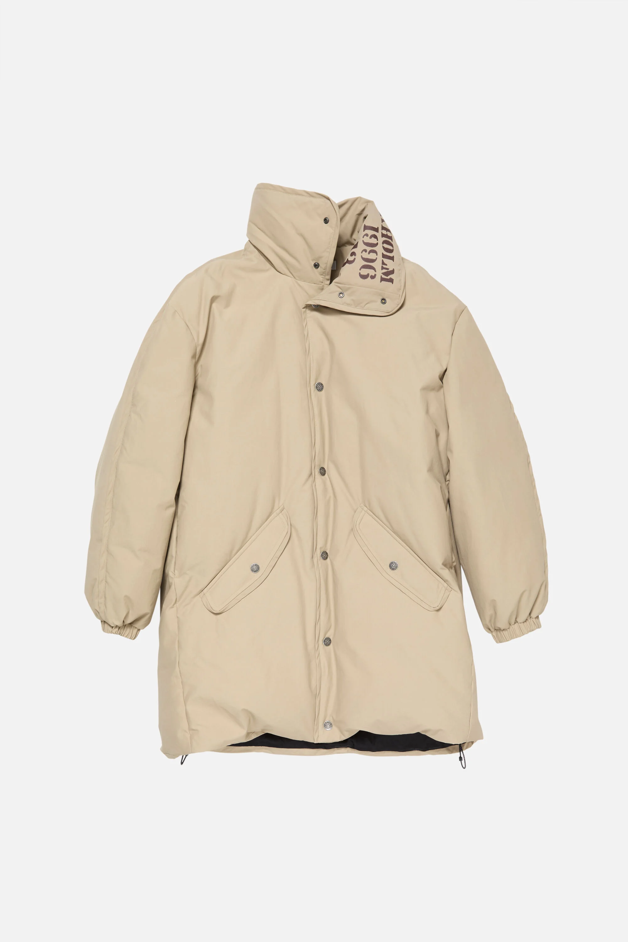 Down jacket crafted from recycled nylon, featuring a raised collar with seasonal print. Designed with a snap button closure, flap front pockets, side seam pockets, and elasticated cuffs. Finished with internal drawcords for adjustability. Cut to a regular fit with relaxed sleeves and a below-knee length. - Regular fit - Below-knee length - Relaxed sleeves - Raised collar with artwork - Front flap pockets - Side seam pockets - Elasticated cuffs - Front snap button closure - Fully lined - Model is 187 cm / 6'1 and wears a size 46 - Style ID: FN-MN-OUTW001190 - Made with organically grown cotton and recycled nylon - Filling made from recycled down and recycled feathers - Shell: 48% Nylon, 52% Cotton, Lining: 100% Viscose, Filling: 90% Duck down, 10% Duck feathers
