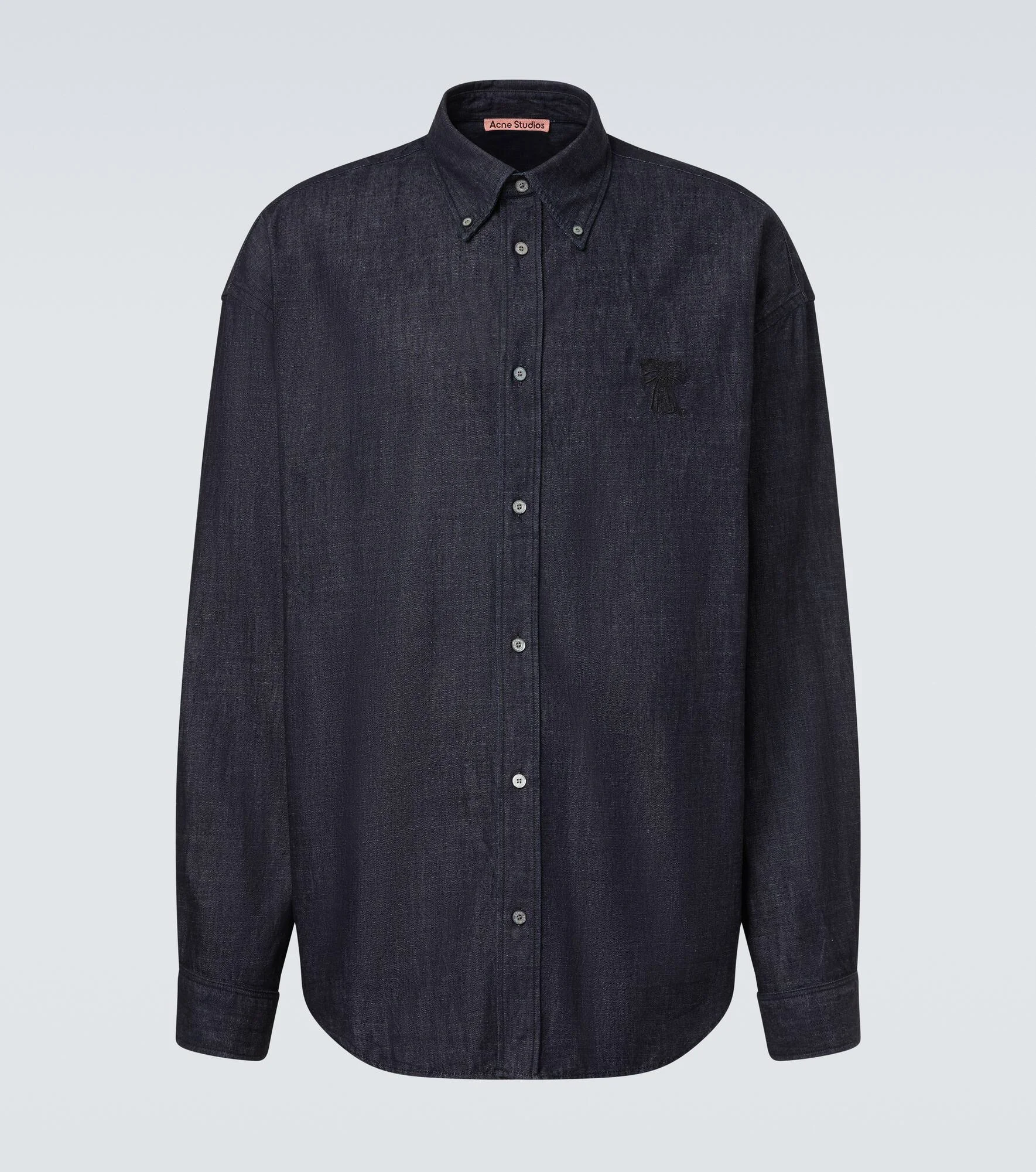 Stockholm-based Acne Studios has earned a firmly established cult following through its cool Scandinavian aesthetic. Made from dark blue denim, this shirt is finished with an embroidered detail on the chest. Product Details - Material: 100% cotton - Care instructions: hand wash - Made in Morocco - Color: blue - Designer color name: Mid Blue - Contains non-textile parts of animal origin - Collar: button-down - Closure: buttoned front - Cuff: one button - Item number: P01139533 Size & Fit - True to size - Designed for a loose fit - Non-stretchy fabric - Falls below the hip - The model in the picture is 185cm-6'1" and wearing a size IT 50