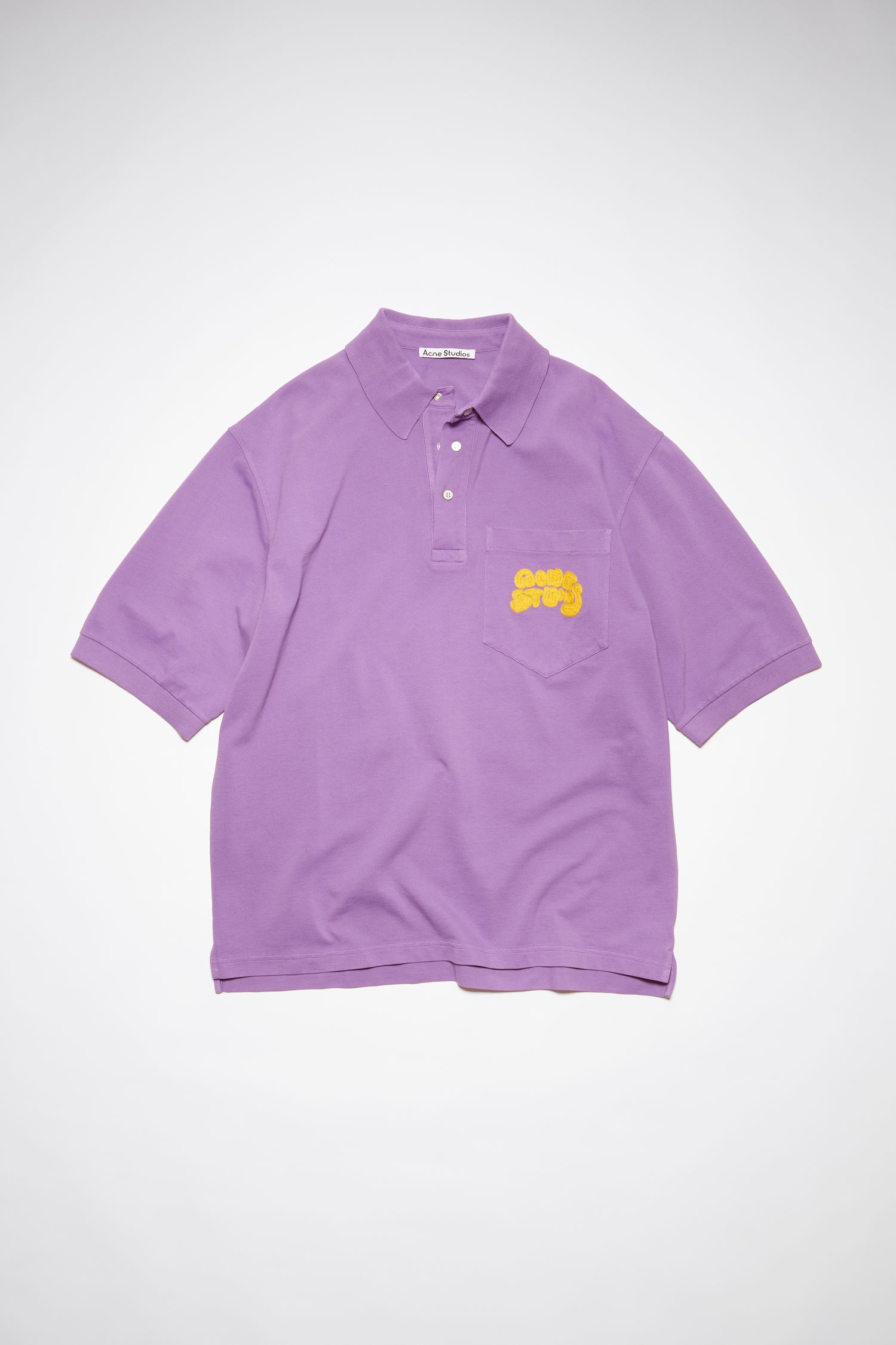 embroidered-logo polo shirt from Acne Studios FPS featuring lilac purple, cotton, embroidered logo at the chest, polo collar, short front button fastening, short sleeves, chest patch pocket and straight hem. Highlights - Lilac purple - Cotton - Embroidered logo at the chest - Polo collar - Short front button fastening - Short sleeves - Chest patch pocket - Straight hem Imported Composition Cotton 100%