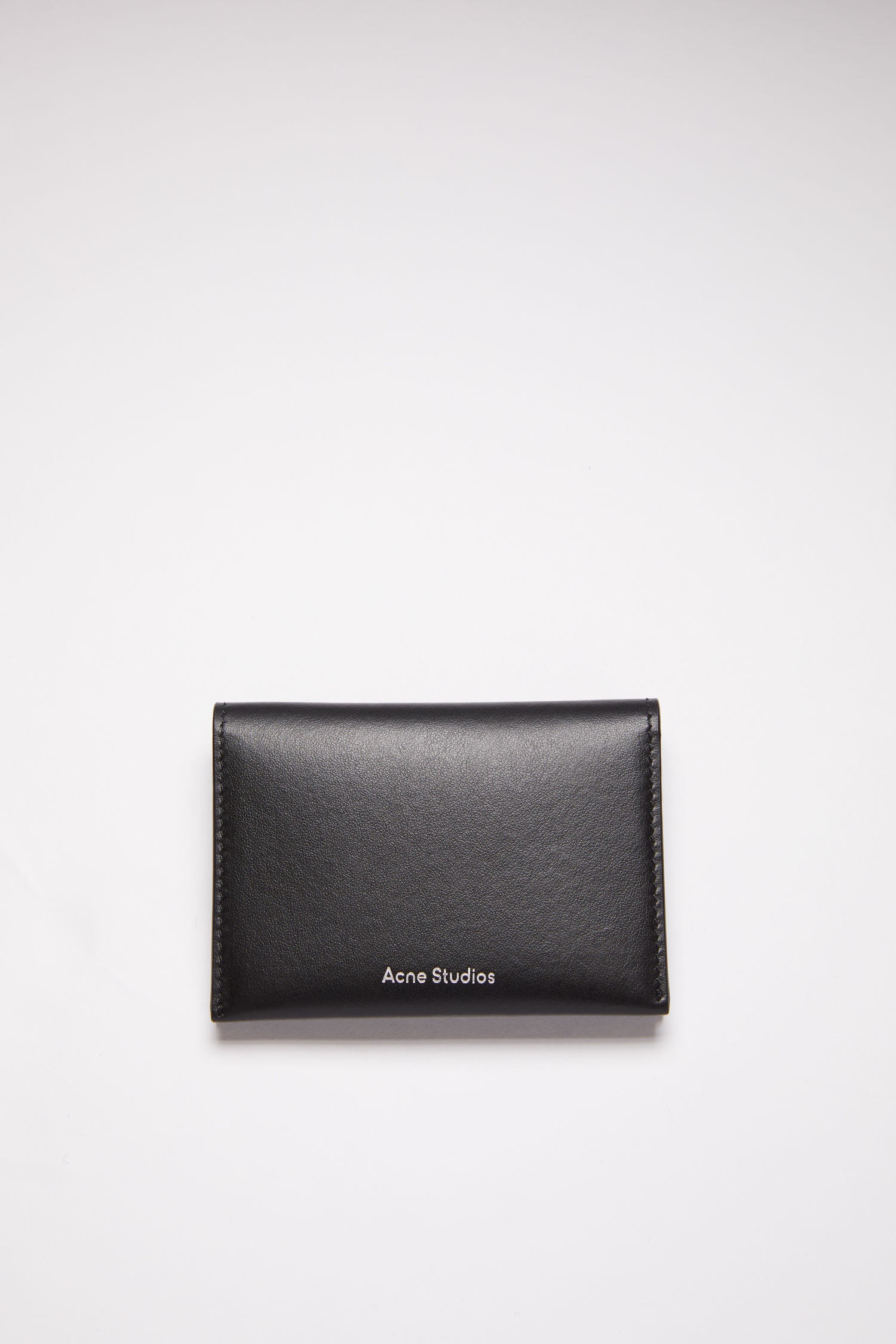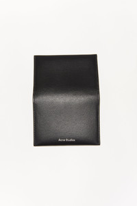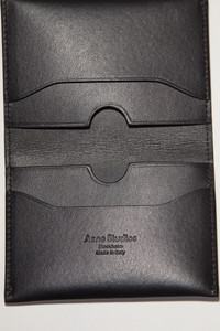 Acne Studios black card case is made of soft calf leather and has four card compartments on the interior. Details: - Folds in half - Four flat card compartments on interior - Silver Acne Studios logo stamp - Style ID: FN-UX-SLGS000104 - Main material: 100% leather Sizing: - Length: 13.5 cm/ 5.3in - Width: 11 cm/ 4.3in - Depth: 1.5 cm/ 0.6in