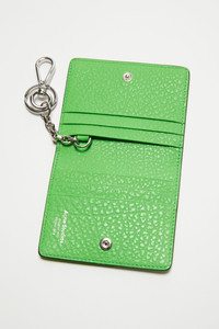Card holder wallet features a folded opening with a snap button closure, crafted from grained leather and detailed with an Acne Studios logo. Complete with interior card holder compartments, chain, clip and ring attachment. - Folded opening - Snap button closure - Acne Studios logo - Card holder compartment - Chain, dog clip and keyring - Measurements: 7.7 cm; 10 cm; 2 cm - Style ID: FN-UX-SLGS000276 - Shell: 100% Calf leather, Lining: 100% Viscose