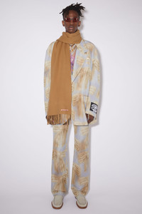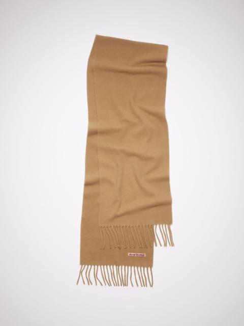 Acne Studios dark camel melange fringed scarf is detailed with a pink Acne Studios label, crafted from midweight wool. - Fringed ends - Midweight wool - Pink Acne Studios label - Measurements including fringe: 190 cm x 28 cm - Fringe measurements: 7 cm approx. - Made in Italy - Style ID: FN-UX-SCAR000219 - Made with certified wool according to the Responsible Wool Standard - Shell: 100% Wool
