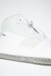 Acne Studios white/green high top sneakers are made of grained calf leather with crackled suede panels and a script logo. - Basketball-inspired - Calf leather, nubuck, perforated suede - Lace-up - Chunky soles with logo and face - Branded back loops - Metallic logo - Mini face basketball charm - Style ID: 08STHLM High Mix M - Uppers: 100% Cow leather, Soles: 100% Thermoplastic polyurethane, Lining: 100% Nylon