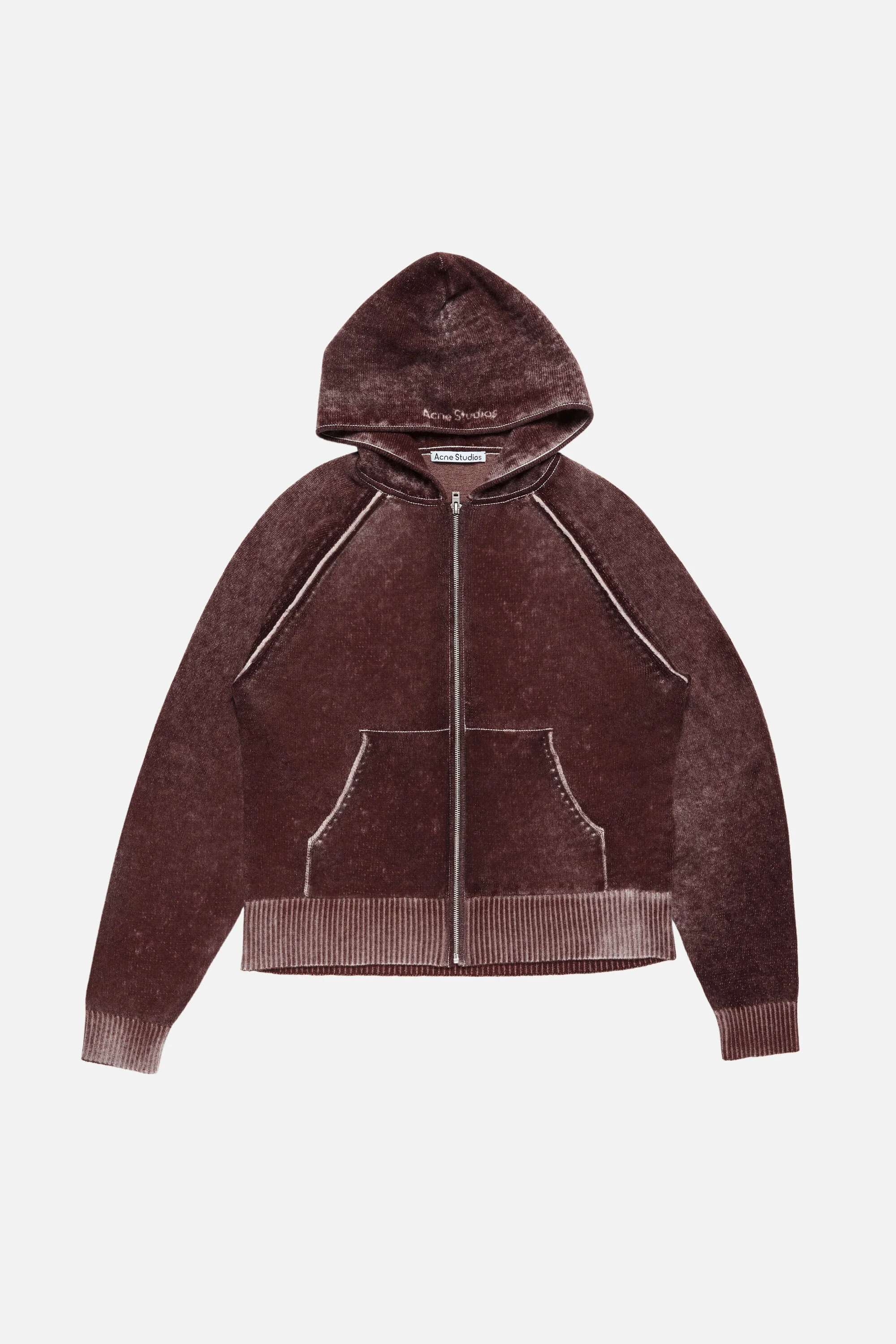Hooded sweater crafted from a soft wool-cashmere blend, featuring a trompe l’oeil inside-out print with a vintage-inspired finish. Detailed with an Acne Studios logo on the hood. Cut to a regular fit and hip length. - Regular fit - Hip length - Hooded - Inside-out print - Acne Studios logo on hood - Zipper closure - Kangaroo pocket - Ribbed cuffs and hem - Model is 183 cm / 6' and wears a size S - Style ID: FN-MN-KNIT000573 - Shell: 34% Cotton, 10% Cashmere, 56% Wool