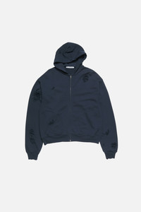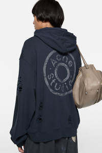 Hooded sweater crafted from soft cotton fleece, featuring a seasonal denim-inspired rivet logo print on the back and distressed details throughout. Cut to a regular unisex fit and hip length. - Regular fit - Hip length - Hooded - Logo print on back - Distressed details - Side seam pockets - Ribbed cuffs and hem - One-way zipper closure - Female model is 178 cm / 5′8 and wears a size XS - Male model is 187 cm / 6'1 and wears a size M - Style ID: FN-UX-SWEA000106 - Made with organic cotton and recycled polyester. - Shell: 15% Polyester, 85% Cotton