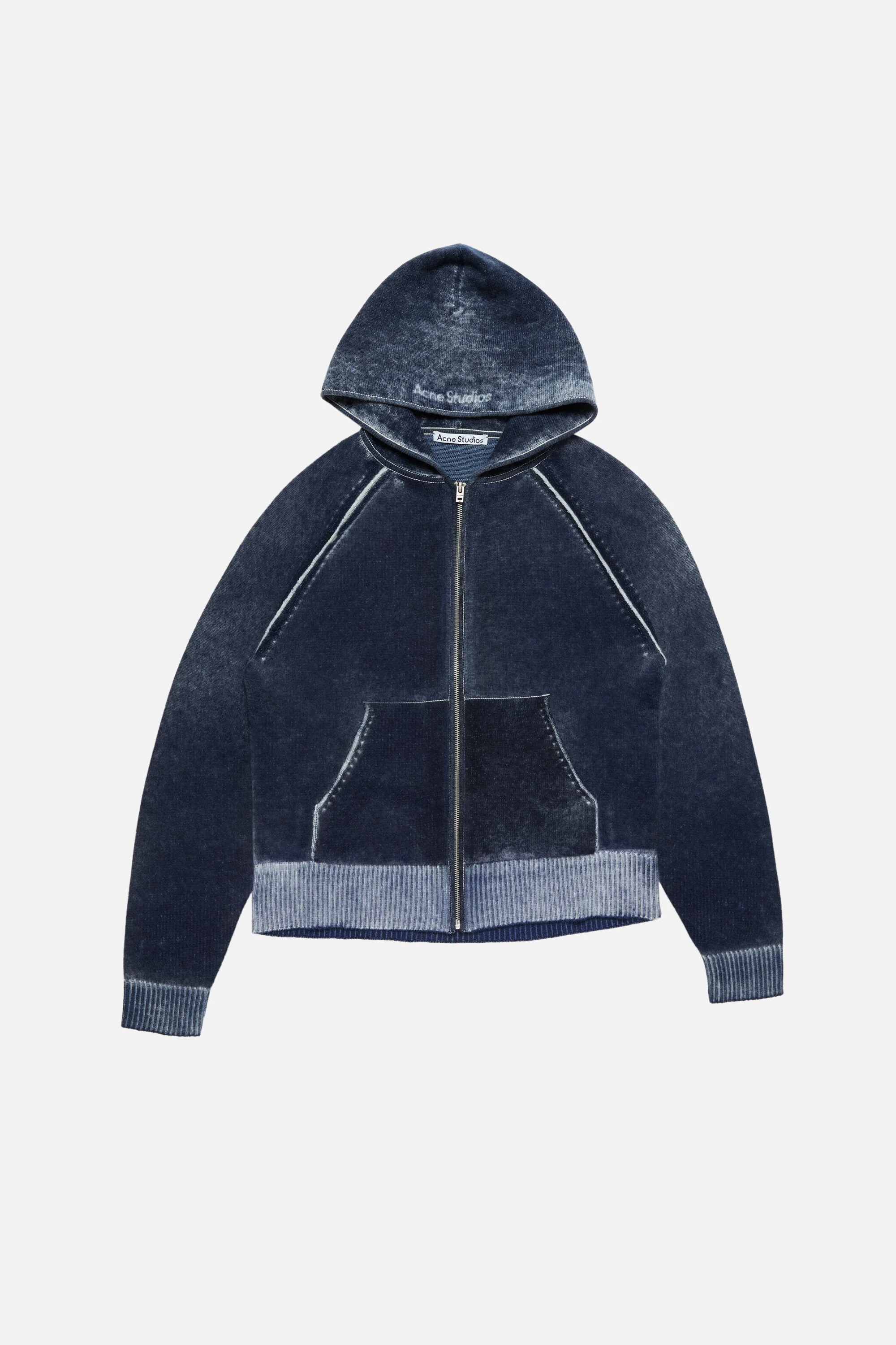 Hooded sweater crafted from a soft wool-cashmere blend, featuring a trompe l’oeil inside-out print with a vintage-inspired finish. Detailed with an Acne Studios logo on the hood. Cut to a regular fit and hip length. - Regular fit - Hip length - Hooded - Inside-out print - Acne Studios logo on hood - Zipper closure - Kangaroo pocket - Ribbed cuffs and hem - Model is 183 cm / 6' and wears a size S - Style ID: FN-MN-KNIT000573 - Shell: 34% Cotton, 10% Cashmere, 56% Wool
