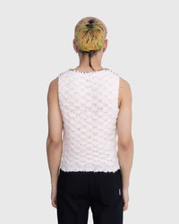 Acne Studios’ penchant for quality fabrics is on full display with this graceful knit vest. Crafted from a wool blend with an inviting pink hue, the timeless vest arrives with a classic round neckline with metallic details that weave through the seams. Size & Fit The model is wearing a size M, and is 183cm / 6’0” tall with a 83 cm / 32.6’ chest. While this piece is from the men’s collection, we shoot on female, male, and non-binary models. Product Details Shell: 34% acrylic, 25% wool, 25% polyester, 16% nylon. Round neckline. Metallic details.