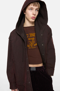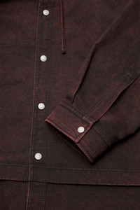 Hooded jacket with a layered construction, crafted from cotton satin with a peached finish and double-dyed for a textured look. Features an external drawcord, snap button closure, side seam pockets, and embroidered logo on the chest. Cut to a relaxed fit. - Relaxed fit - Hood with external drawcord, - Layered construction - Snap button closure - Side seam pockets - Embroidered logo - Model is 186 cm / 6'1 and wears a size 46 - Style ID: FN-MN-OUTW001240 - Made from organically grown cotton - Shell: 100% Cotton