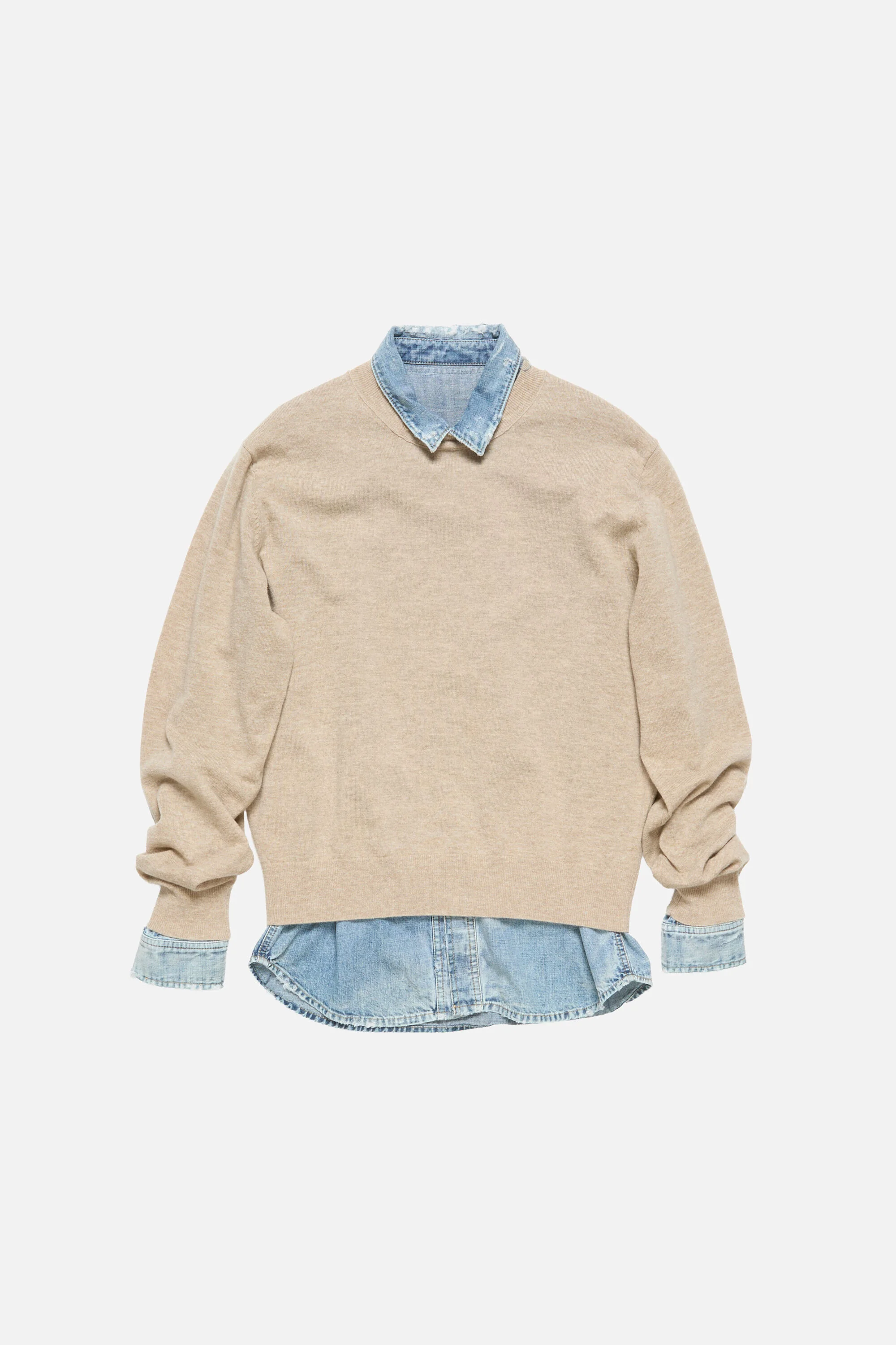 Crewneck sweater with a layered construction, crafted from wool with a denim collar and shirting underlayer. Complete with a metal branded rivet at the back neckline. Cut to a regular fit with relaxed sleeves and hip length. - Crewneck sweater - Regular fit - Hip length - Relaxed sleeves - Denim collar - Shirting underlayer - Metal branded rivet - Model is 179 cm / 5'9 and wears a size S - Style ID: RW-WN-KNIT000012 - Shell: 100% Wool, Contrast: 100% Cotton