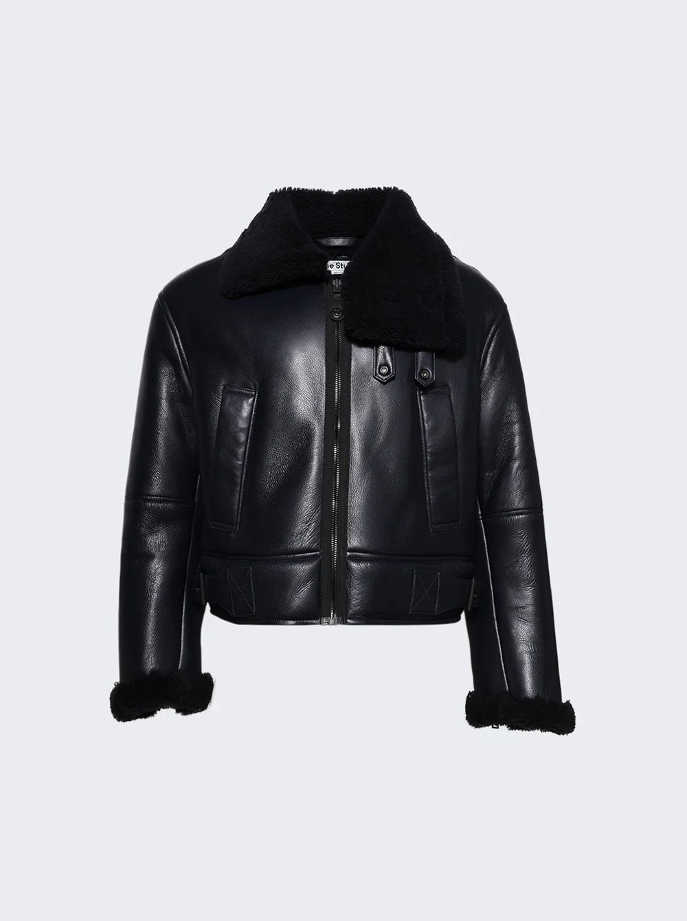 Details - Shearling dark navy blue biker jacket - Full-grain leather with a shiny finish - Shearling collar and trim - Biker strap detail on collar - Waist pockets - Adjustable side tabs with buckers - Zippered sleeves - Metal logo plaque at the back neckline - Material: 100% Lamb shearling Vendor Color Code: Brand Style: B70157 Designer/Brand: ACNE STUDIOS
