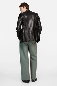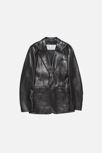 Single-breasted suit jacket crafted from full-grain leather with a soft, smooth finish. Features a single leather-covered button, chest welt pocket, double-jetted flap pockets, and a full lining. Cut to a regular fit with a hip-length hem. - Single-breasted suit jacket - Regular fit - Hip-length - Single leather-covered button - Chest welt pocket - Double-jetted flap pockets - Fully lined - Model is 190 cm / 6'2 and wears a size 46 - Style ID: FN-MN-LEAT000316 - Shell: 100% Lamb leather, Lining: 50% Viscose, 50% Acetate