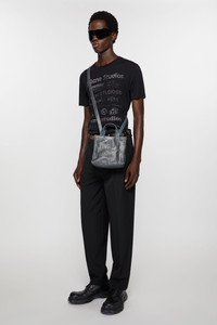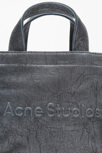 Logo mini tote bag features an Acne Studios embossed logo on the front panel, crafted from cotton with a silver-coated finish. Complete a small zippered interior compartment and shoulder strap. - Embossed Acne Studios logo - Small zippered compartment - Acne Studios pink label - Shoulder strap - Hand straps - Measurements: 20.5 cm x 18 cm x 9.5 cm - Strap measurement: 56 cm approx. full length - Style ID: FN-UX-BAGS000164 - Each foil-coated finish may differ slightly in shade - Shell: 100% Cotton, Lining: 65% Polyester, 35% Cotton