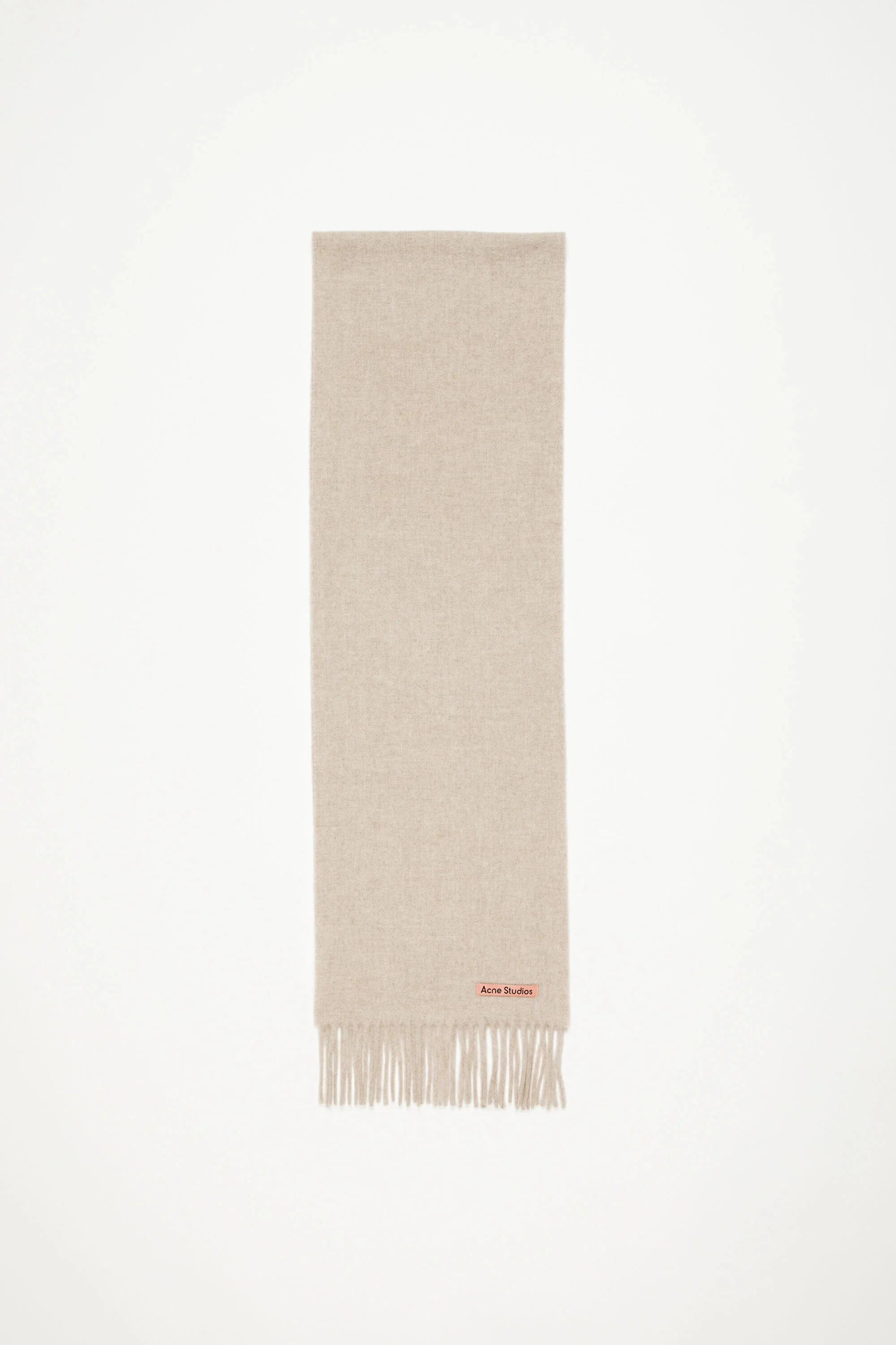 Fringed scarf is detailed with a pink Acne Studios label, crafted from midweight wool. - Fringed ends - Midweight wool - Pink Acne Studios label - Measurements including fringe: 190 cm x 28 cm - Fringe measurements: 7 cm approx. - Made in Italy - Style ID: FN-UX-SCAR000219 - Made with responsible wool. - Shell: 100% Wool
