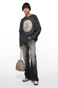 Long-sleeve crewneck t-shirt with a layered construction, crafted from soft cotton jersey. Features a seasonal denim-inspired rivet logo print on the front and distressed details throughout. Cut to a relaxed unisex fit and hip length. - Relaxed fit - Hip length - Layered long sleeves - Logo print on front - Distressed details - Female model is 176 cm / 5'7 and wears a size XS - Male model is 187 cm / 6'1 and wears a size M - Style ID: FN-UX-TSHI000156 - Made with organically grown cotton and recycled polyester - Shell: 75% Cotton, 25% Polyester, Contrast: 75% Cotton, 25% Polyester