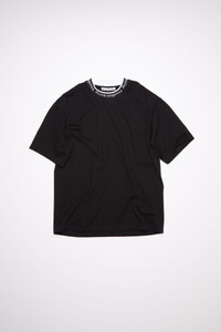 Acne Studios black logo rib t-shirt is made from recycled nylon with a relaxed fit. Details: - Logo rib crewneck - Style ID: FN-MN-TSHI000243 - Made from recycled nylon - Main material: 67% EcoVero viscose, 27% recycled nylon Sizing: - Relaxed fit - European sizing - Model is 187cm/ 6'1" and wears a size S