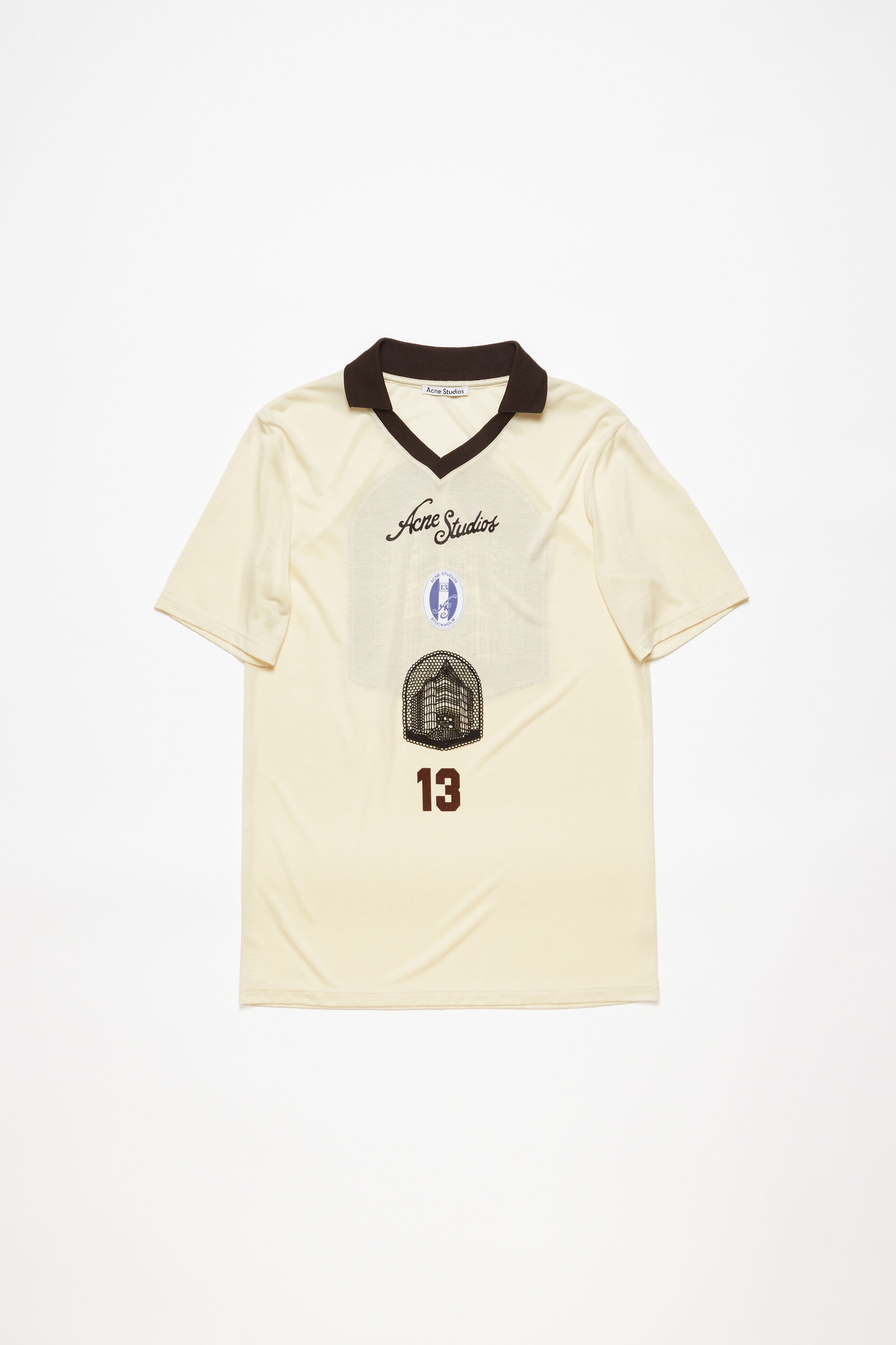 T-shirt is cut to a regular fit a below hip length. Detailed with seasonal logo prints on the front in back. Crafted from a lightweight satin fabric with a sport shirt-inspired construction. - Regular fit - Below hip length - Logo prints front and back - Ribbed neckline and cuffs - Model is 186 cm / 6′2 and wears a size S - Style ID: FN-MN-TSHI000542 - Shell: 90% Lyocell, 10% Kapok