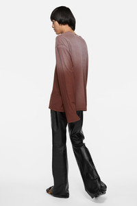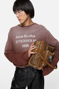 Long-sleeve crewneck T-shirt crafted from irregular jersey, piece-dyed with a vintage spray, and finished with distressed ribbing at the neckline, cuffs, and hem. Made from organically grown cotton, each piece develops a unique appearance. Features the Acne Studios 1996 logo print on the front. Cut to a relaxed unisex fit with hip length. - Relaxed unisex fit - Hip length - Sprayed finish - Stamp log - Distressed neckline, cuffs and hem - Female model is 177 cm / 5’8 and wears a size XS - Male model is 188 cm / 6′2 and wears a size M - Style ID: FN-UX-TSHI000016 - Made from organically grown cotton - Shell: 85% Cotton, 15% True hemp