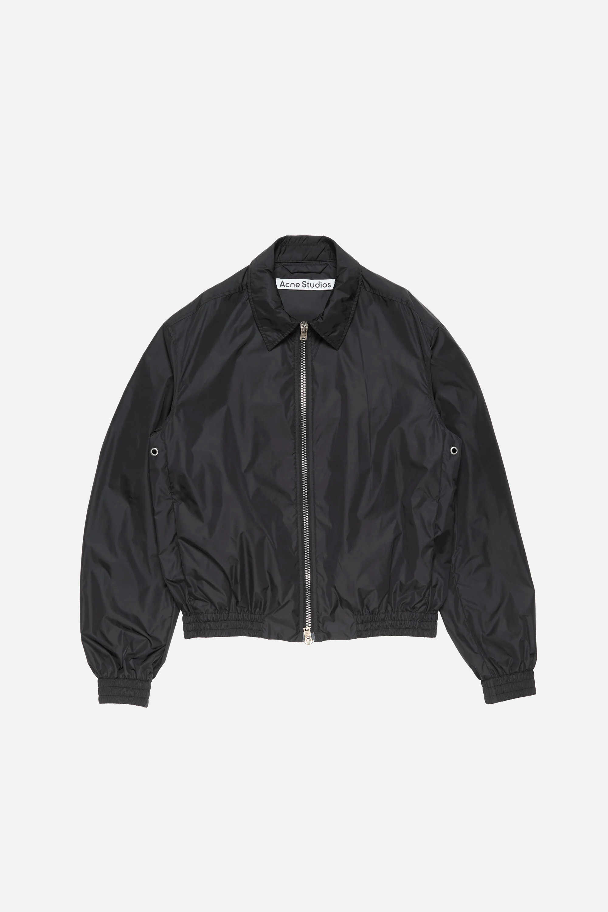 Jacket with collar featuring the Acne Studios 1996 logo on the back, crafted from lightweight, clean nylon with a papery texture and semi-shiny finish. Complete with side seam pockets and elasticated cuffs and hem. Cut to a regular fit and below-waist length. - Jacket with collar - Regular fit - Below-waist length - Logo on the back - Side seam pockets - Elasticated cuffs and hem - Model is 188 cm / 6'1 and wears a 46 - Style ID: FN-MN-OUTW001277 - Shell made from recycled nylon. Lining made with recycled polyester. - Shell: 100% Nylon, Lining: 55% Polyester, 45% Viscose