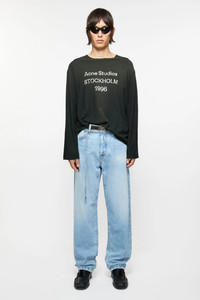 1991 jeans are cut to a loose unisex fit with a low to mid-waist, matching thin belt, straight leg and regular length. Made of rigid denim in a light blue wash. - Loose fit - Low to mid waist - Straight leg - Regular length - Thin belt - 5-pocket construction - Button fly - Female model is 179cm/ 5'11" and wears a size 29/34 - Male model is 185cm/ 6'1" and wears a size 29/34 - Style ID: Acne Studios 1991 Toj Light Blue Vintage - Made from organically grown cotton. - Shell: 100% Cotton, Pocket Lining: 65% Polyester, 35% Cotton, Patch: 100% Cow leather